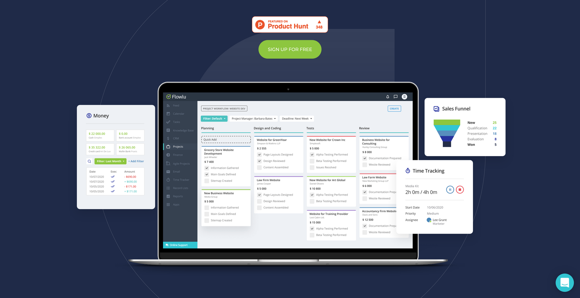 If you are looking for business management software, you might want to take a look at Flowlu. Flowlu includes all the essential online tools to run your company from project & customer relationship management to finance tracking in one single place. No matter, if you need checklists, kanban boards, time tracking, project workflows, or if you want the power of custom fields to create a customized workflow, Flowlu got you and your business covered. Organize, prioritize, and harmonize. Besides that, Flowlu also delivers a huge time-saver by automating invoice and estimate generations, read through clear analysis and reporting using graphical charts and data sets, manage multiple accounts, optimize your expenses and increase your profit. Get all the financial management insights you need, cash flow forecasting, online payments, recurring invoices, and a lot more. In the beginning, I told you, that Flowlu includes all the essential online tools to run your company. We already covered productivity, financial, and now let me tell you that Flowlu also covers customer relationship management. For remote teams, Flowlu offers a deeply integrated collaboration. Discuss projects, tasks, deals, and customers with your colleagues. As all of this wasn't already impressive, you can also create stunning guides and make them available to your entire team to build up your company's knowledge base. Super impressive tool, with a lot of different workflows.