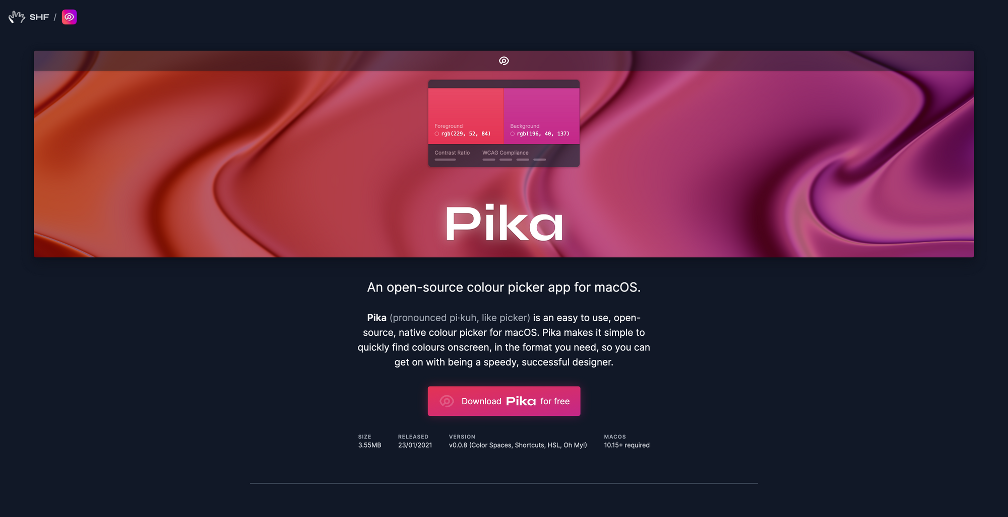 I got super excited when I found out about Pika. Pika is a super lightweight, open-source color picker for macOS. Such little helpers always excite me. Especially, since Pika is also open-source. So, what exactly does Pika for you? Well, Pika makes it incredibly easy to quickly find colors onscreen, in the format you need, so you can get on with being a speedy, successful designer. Pika is a super lightweight tool, tucked in your menu bar, Pika gets out of the way when you don't need it. After picking up colors, you can quickly compare them regarding WCAG compliance. Pika is already lightning-fast and native, but if you want it to be even faster, you can use a simple global hotkey so you can access Pika from anywhere, then use ⌘D and ⇧⌘D to start picking. On top of that, you can choose from popular color formats like hex, RGB, HSB, or HSL, and seamlessly copy colors for other applications with ⌘C and ⇧⌘C. You can download Pika completely for free. Super handy and useful little tool. If you are a designer and Mac user, this is a must download and install.