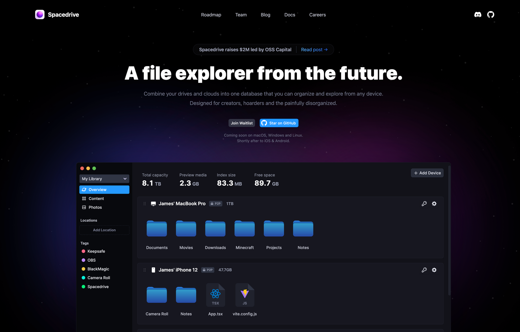 Spacedrive is open-source, you can star the project on GitHub and support it on Open Collective. As of writing this, Spacedrive has not arrived yet. You can sign up for the waitlist, and follow the development on GitHub. Spacedrive will be available for macOS, Windows, and Linux first, with apps for iOS and Android arriving shortly after. Spacedrive is an incredible existing open-source tool, and I can not wait to see what they are building. On June 13th, they also announced a $2m funding round lead by Joseph Jacks from OSS Capital, and investors like Naval Ravikant, Guillermo Rauch, Tobias LĂŒtke, and more joining the round.