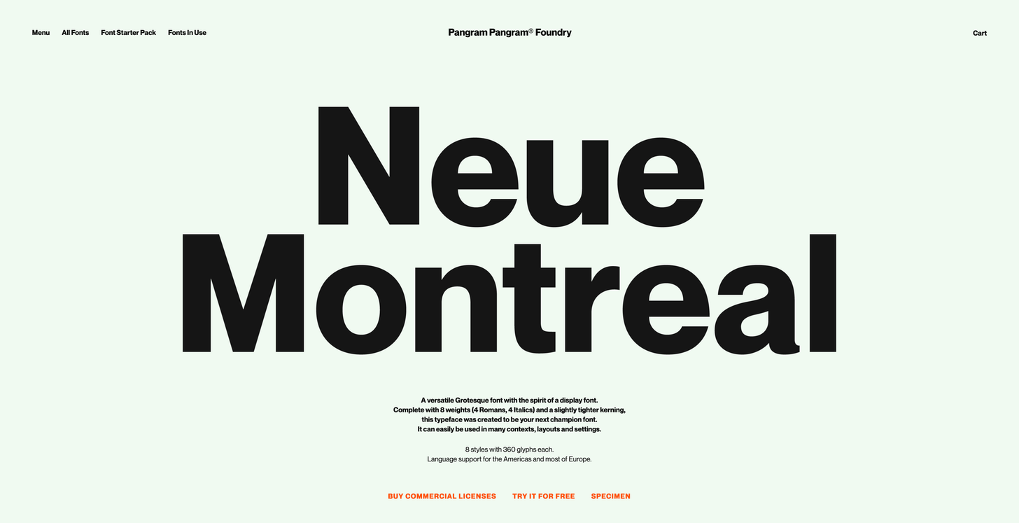 Neue Montreal is a sans-serif typeface designed by Mathieu Desjardins and published through Pangram Pangram in 2018. The design was inspired by neo-grotesques such as Helvetica but features tighter spacing which makes it excel in display settings. The family is available in four weights with matching italics.