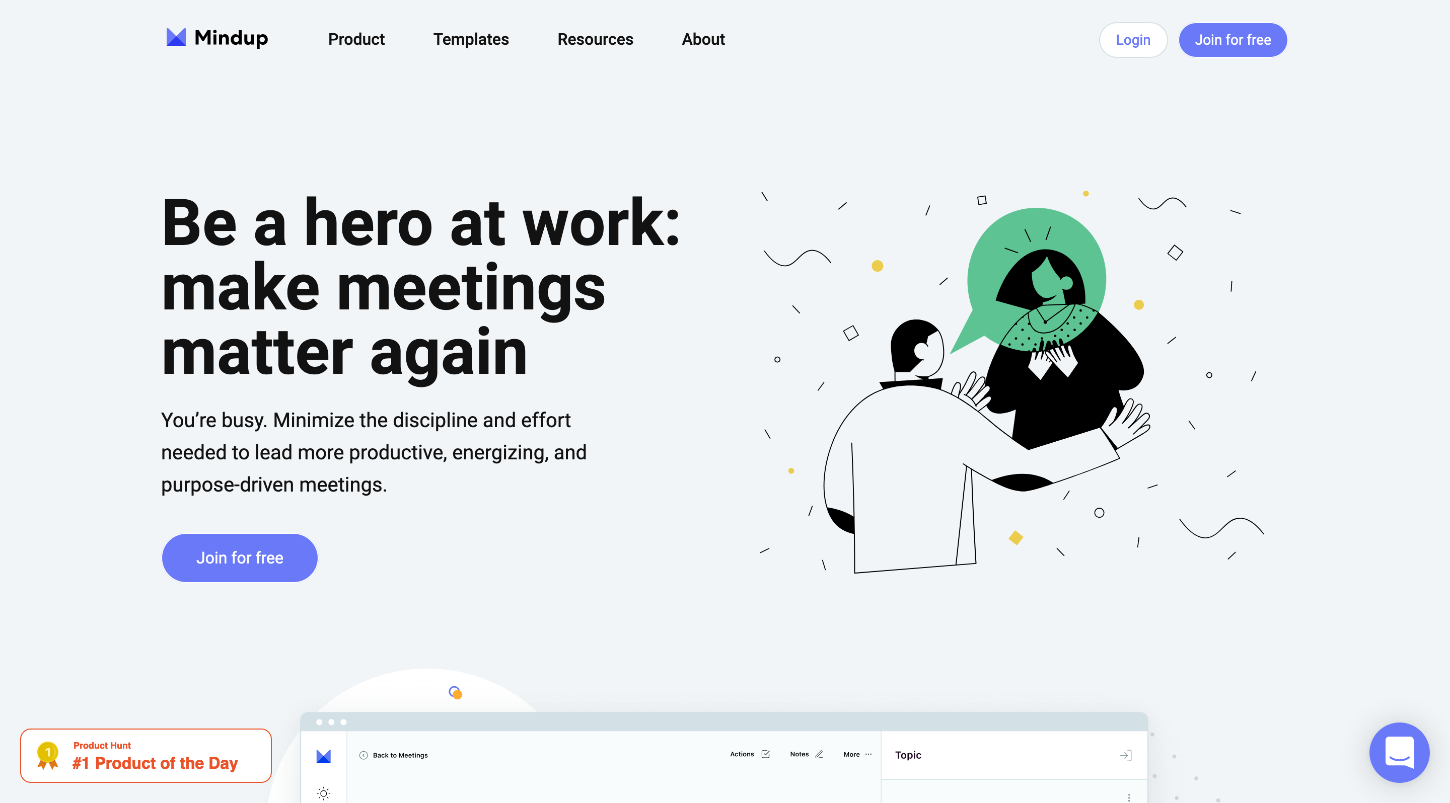 Meetings done wrong can block your productivity, but meetings done right can boost your productivity and energize your workflow. Mindup wants to help you make meetings matter again. Minimize the discipline and effort needed to lead more productive, energizing, and purpose-driven meetings. With Mindup you can create a collaborative agenda to help your team stay focused and avoid wasted time. So, how can you actually make meetings matter again while using Mindup? Prepare ahead of time: with Mindup you can share topics and comments to help your team come more prepared for meetings that lead to results. Hold everyone accountable: Mindup gives you the possibility to simply add action items and assign them to someone as your mutual conversation continues. Review past decisions: With Mindup you will never forget what got discussed during a meeting, come back to your meeting notes long after the meeting is over to revisit what was decided. Mindup helps you start straight away with dozens of interactive agenda templates across a variety of topics to lead more focused meetings. Mindup is the one tool you want to use if you want to boost your meetings and skyrocket your productivity.