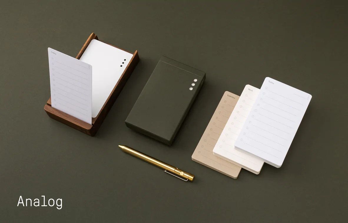 Analog is a physical companion for your digital tools that helps you prioritize and focus on your most important tasks. Analog doesnât replace your digital tools, it works alongside them.