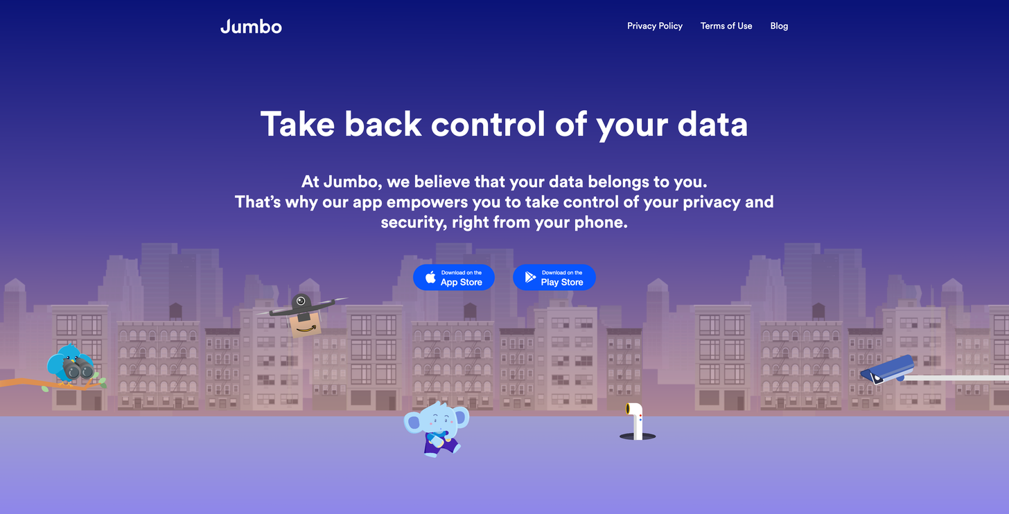 At Jumbo, we believe that your data belongs to you. Thatâs why our app empowers you to take control of your privacy and security, right from your phone.