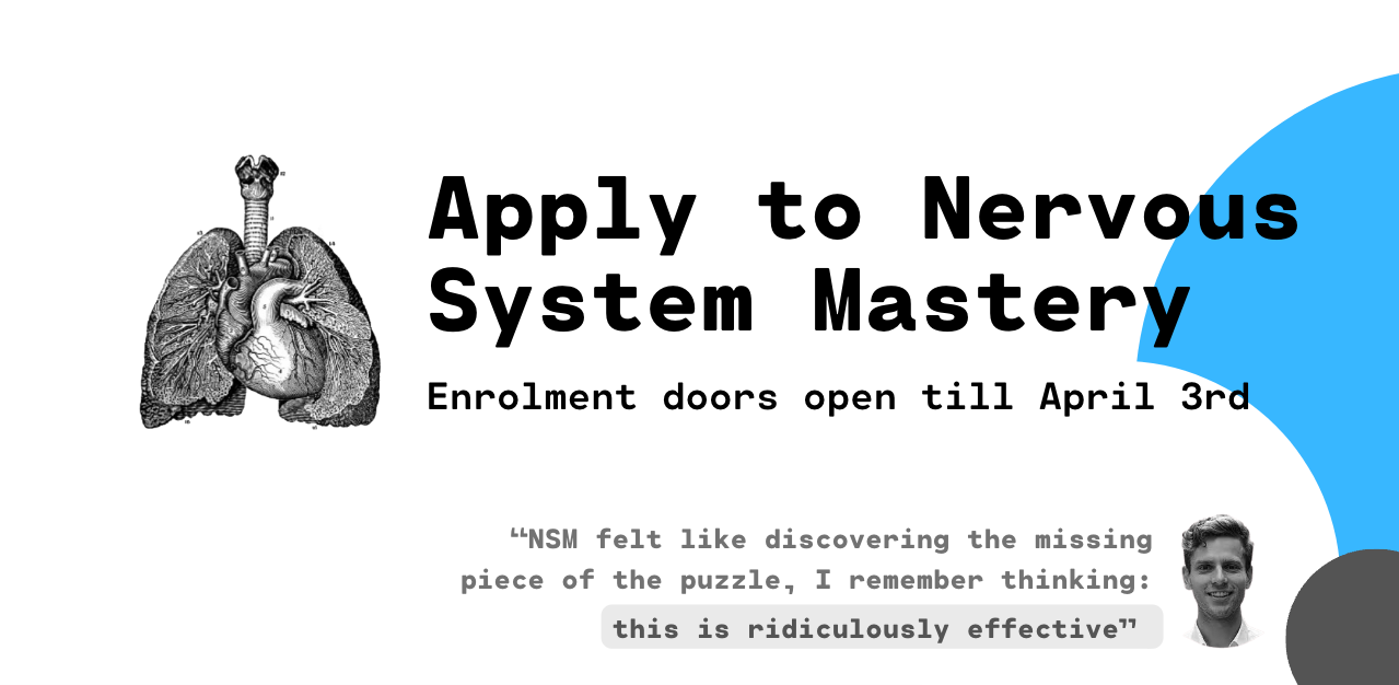Nervous System Mastery is an online bootcamp that will equip you with evidence-backed protocols to cultivate greater calm and agency over your internal state.