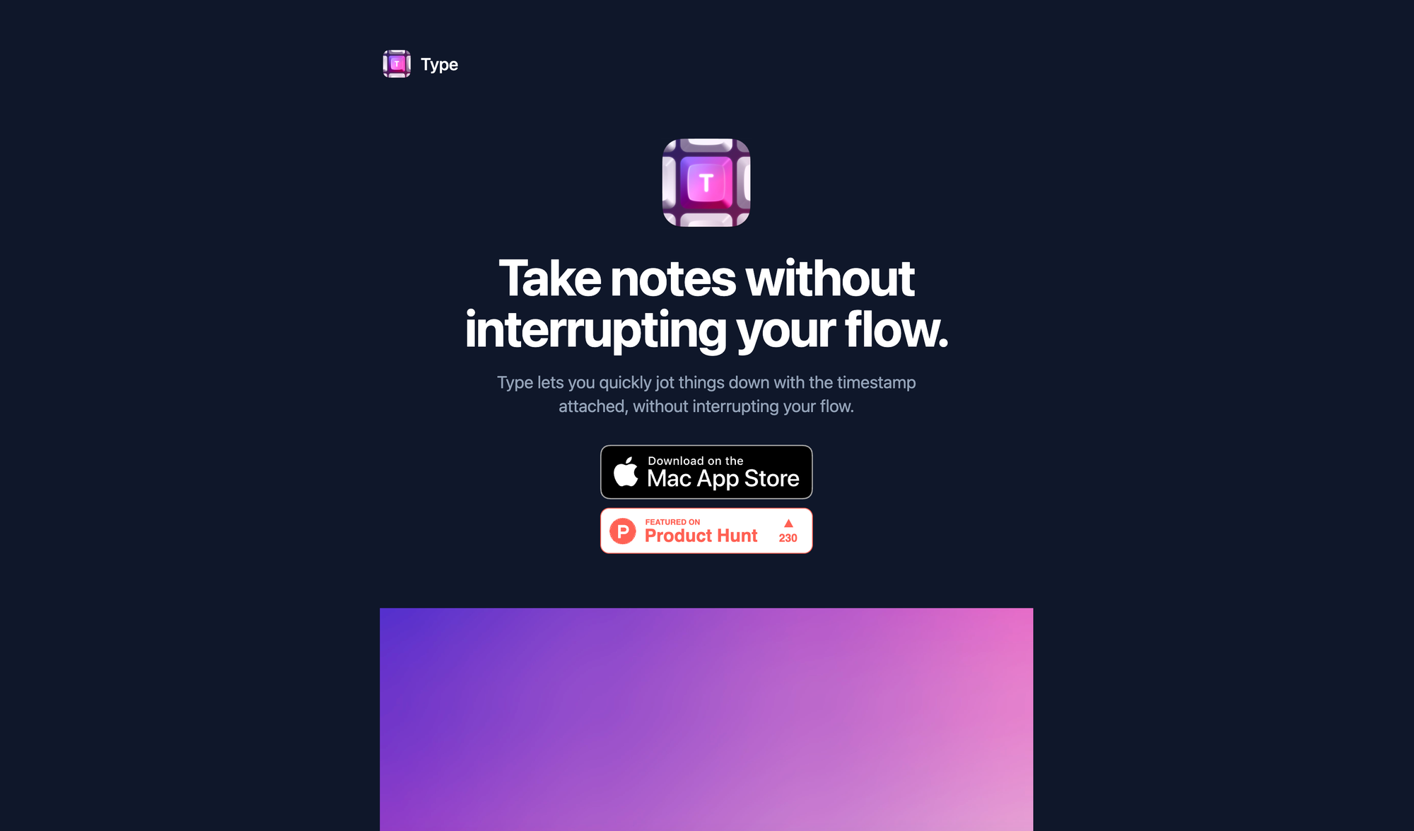 In the real of note-taking apps, Type offers a unique approach that caters to diverse user needs. As Typeâs goal is to give users the possibility to take notes without interrupting their flows, it stands apart from conventional note-taking tools. With Type you can quickly jot things down with the timestamp attached. It is a fast and easy approach to keep track of things you need to remember, without ever interrupting your flow and the things you are working on.