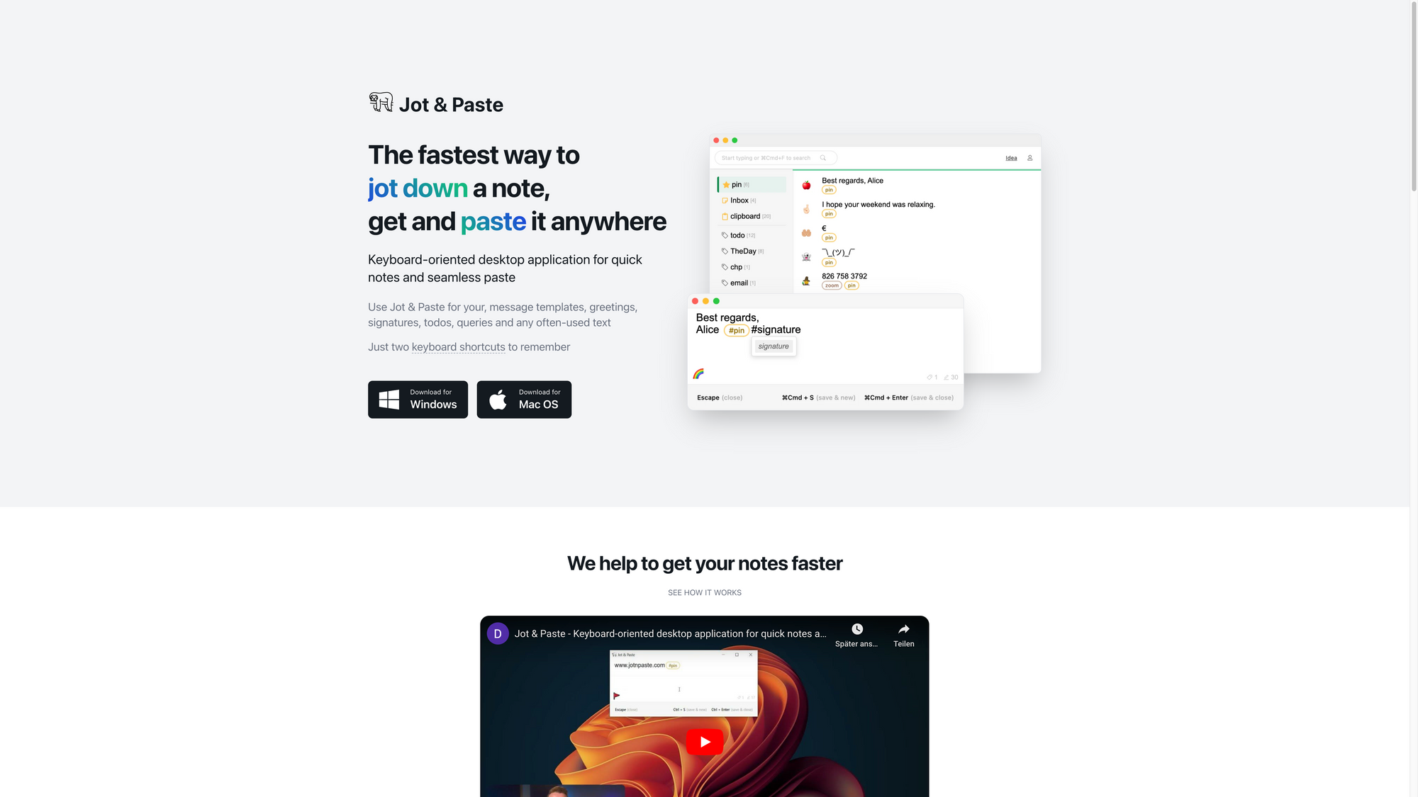 I am seeing a demand for quick capture apps or at least possibilities to quickly capture notes, thoughts, and ideas, and somehow connect them to your general notes. Most of the apps I have discovered within that field over the last couple of months were all built for mobile operating systems. Jot & Paste follows a similar approach of giving you the possibility to quickly jot down and save a note, but compared to all the mobile-oriented quick capture apps, Jot & Paste was built for Windows and macOS as a desktop application. On its website, Jot & Paste even states it be "the fastest way to jot down a note, ...". Jot & Paste was built to help you get your notes faster, by delivering a truly keyboard-driven experience. All you need to do is to remember two keyboard shortcuts. The first one is Cmd+Shift+Enter (or Ctrl+Shift+Enter on a Windows PC) to bring up the Jot & Paste input window. No matter which app is currently open on your desktop, hitting this shortcut lets you quickly jot down a note.