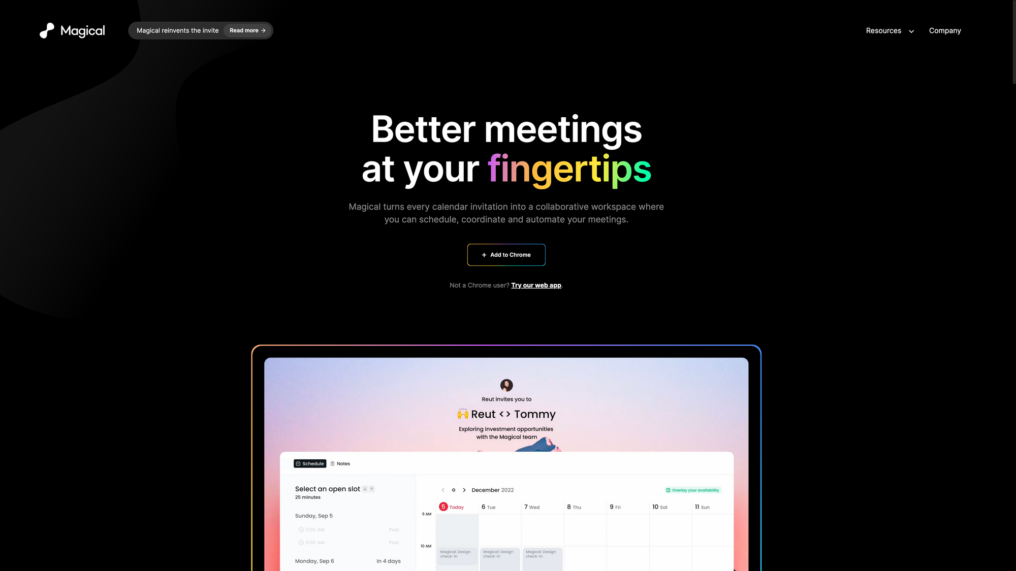 I wrote about Magical for the first time back in August 2022, featuring it in Creativerly 184. In that version of Creativerly, I wrote about their mission to fix the calendar. Besides the landing page of MagicalHQ, there has not been any kind of updates regarding that specific calendar tool. Instead, Magical launched timeOS (a Chrome extension that populates your screen when you open a new tab, letting you take meeting notes and sync them to Notion, see your upcoming meetings, and receive hassle-free reminders) four months ago, and now they are back with Magical.so. At this point, I am not sure if MagicalHQ and Magical.so are either two different products or if they are the same now. On one hand, the landing page at MagicalHQ is clearly directed towards a new calendar tool, but if you visit Magical.so you quickly realise that with this product (or update?), Magical is re-imaging the process of sending out meeting invites. Anyways, let us take a look at Magical (going to stick with that naming throughout the post).