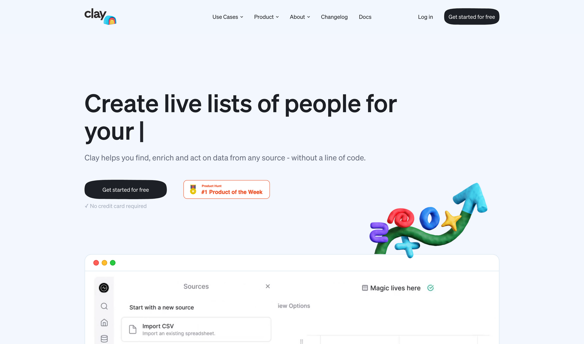 Clay puts your spreadsheets on steroids. If you want to find, enrich, and act on data from any source, without writing a single line of code, Clay is your go-to tool. Clay gives you the power to easily pull in data from your CRM, signup form, LinkedIn, Github, or any other platform via webhook. Once you pulled in the data, you can enrich it, by adding data via tools like Mixpanel or apps like Builtwith. For example, you can stream in waitlist signups from Webflow. Once the data is in Clay, you are able to add Clearbit to identify those users. All of that happens without writing a single line of code.