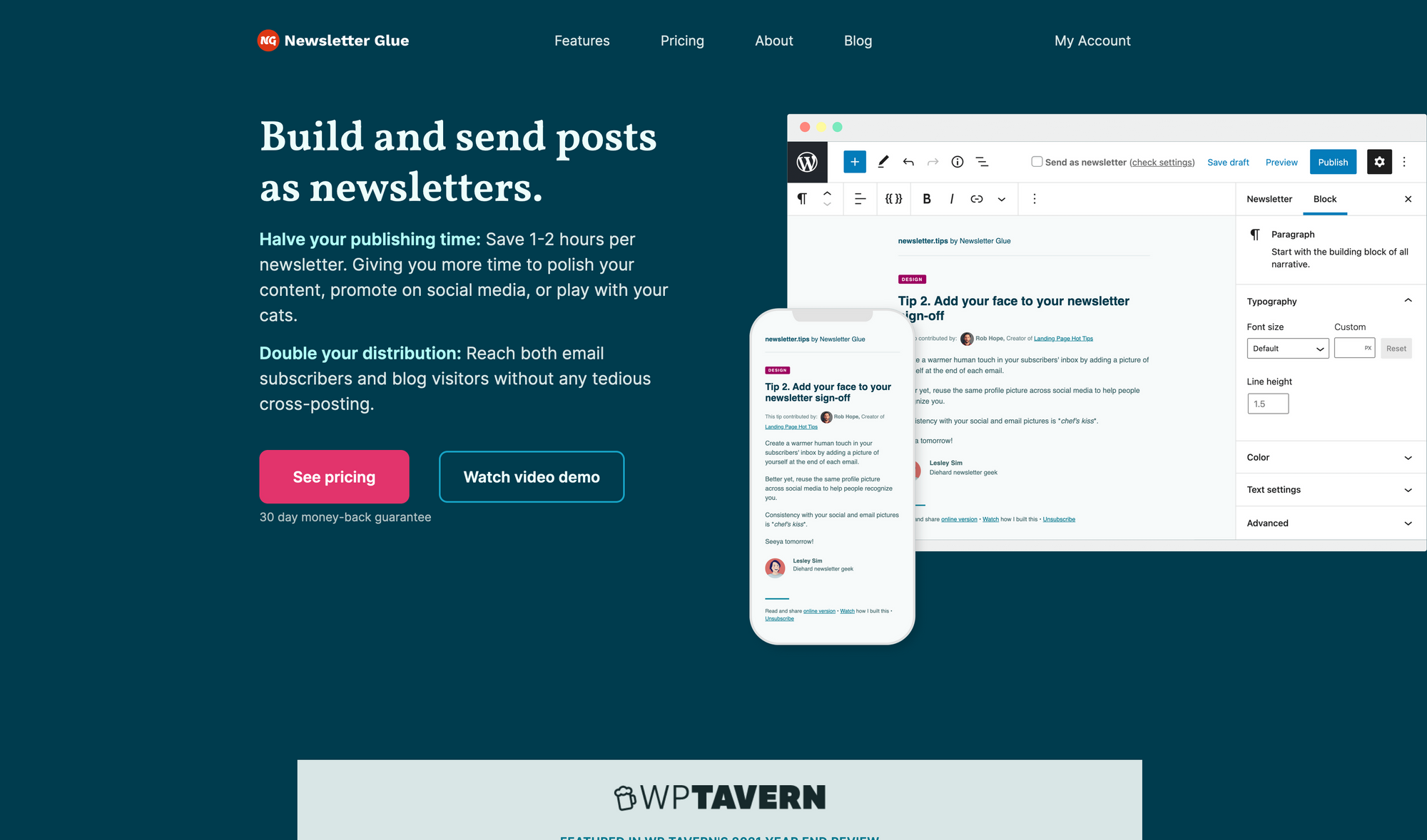 Newsletter Glue is a tool, that lets you build and send posts created with WordPress as newsletters. Although content management systems just like Ghost are getting more and more popular, WordPress still takes up 43% of all the websites currently online worldwide. Loads of people use WordPress to power their blogs and publishing businesses. Newsletter Glue now makes it incredibly easy to send out the post you already want to publish to your blog, as a newsletter too. With Newsletter Glue you can double your distribution as you will reach both email subscribers and blog visitors.