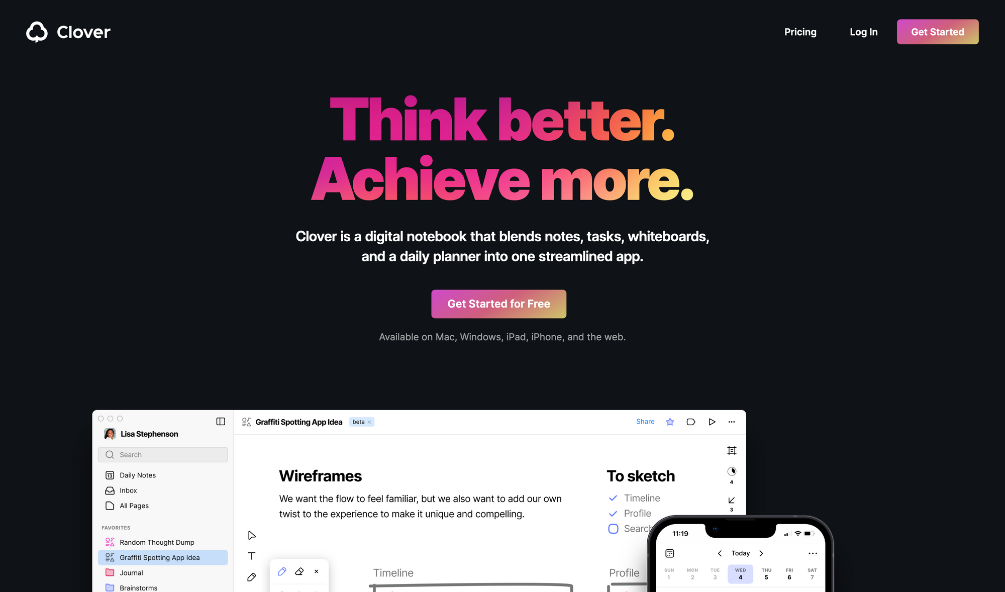 If you are looking for a tool for better brainstorming, enhanced memory, intuitive organization, and workflows you will probably experience like that for the first time, make sure to give Clover a try. Cloverâs infinite canvas unleashes full-fledged creative freedom, combining the best of productivity and creativity within one single tool. With Cloverâs powerful text editor you can create markdown formatting, code block with syntax highlighting, inline tasks, dynamic references, and much more. If you want to, you can add wireframes, notations, and sketches on top of your notes. To network your ideas together, Clover gives you the possibility to link pages together by using backlinks.