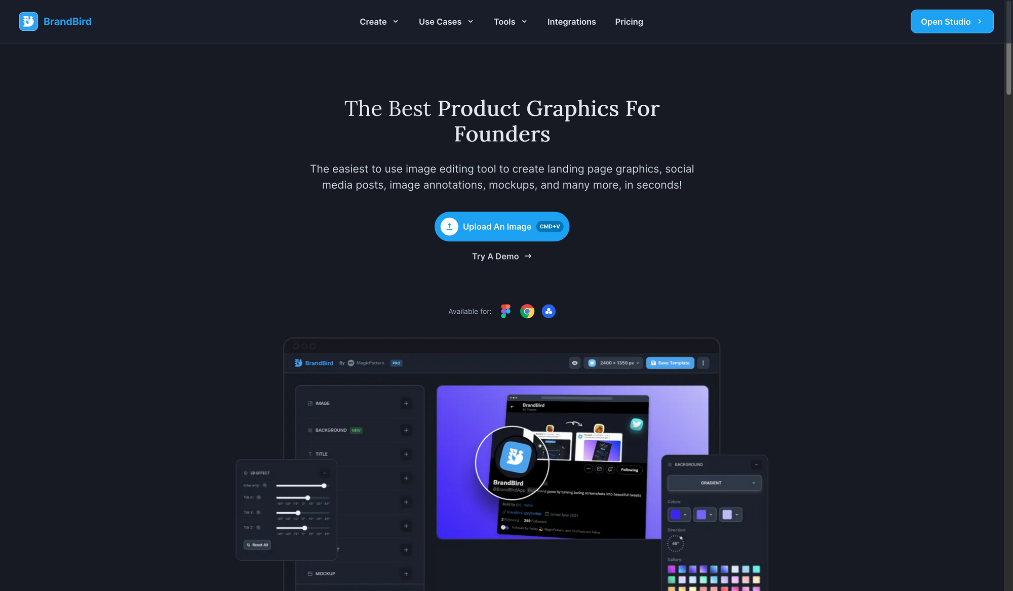 BrandBird is an incredible tool that gives you immediate access to the best product graphics for founders. No matter if you are looking to create landing page graphics, social media posts, image annotations, or anything else, BrandBird got you covered. Using BrandBird to create product graphics is as simple as it can get. All you have to do is drop an image inside the editor, customize it by adding gradient backgrounds, shadows, 3D effects, or mockups, and finally export your finished product graphic to JPG or PNG, after choosing your preferred dimensions.