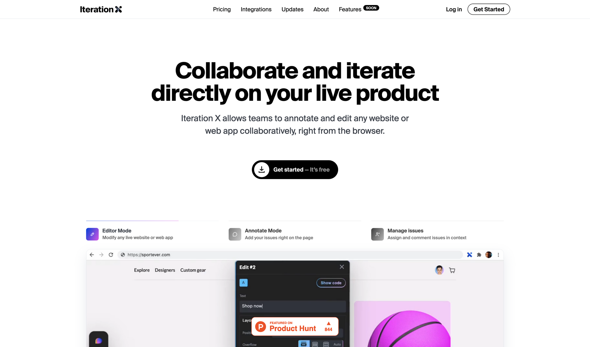 Iteration X consists of three powerful main features. First of all, there is the Editor Mode, which gives you the possibility to modify, edit, or redesign any live website or web app, by editing text, typography, colors and many other CSS properties without writing or changing a single line of code, Iteration X supports no-code. Then there is the Annotate Mode, which lets you keep track of bugs, design issues, typos, and anything else, by flagging those issues directly on any website or web app. Last but not least, Iteration X integrates with Asana, Trello, Jira, and Linear, to manage issues straight within Iteration X. This lets you assign and comment issues in context.