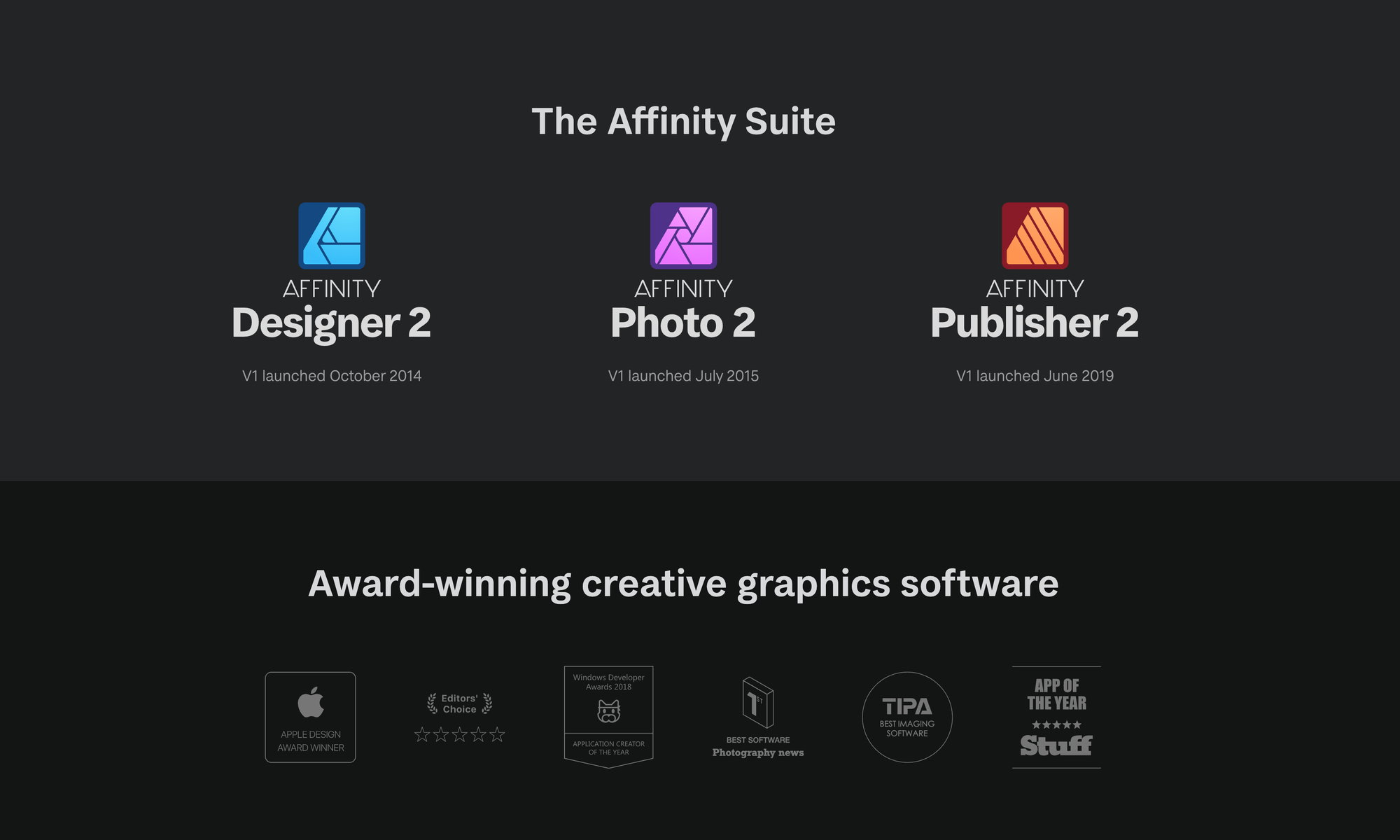 When Adobe announced its acquisition plans, there were a couple of companies who profited from it. Penpot, an open-source Figma alternative, inked $8m in funding as their signups skyrocket 5600% after Adobe's announcement to acquire Figma. Besides that, loads of designers and creative folks used Adobe's urge to create a design monopoly as last resort to leave the platform and search for alternatives. The most popular Adobe Creative Suite alternative out there is the Affinity Suite by Serif, which is trusted by over three million creative professionals. Serif started developing creative software for Windows already in 1987. After building solid apps and creating a viable business throughout 20 years, the team behind Serif decided to focus on developing a super-fast suite of apps for creative professionals using Mac, Windows, and iPad. In October 2014, they presented the first product of this mission, Affinity Designer, an Adobe Illustrator alternative. One year later, Affinity Photo, an Adobe Photoshop alternative, followed. And in 2019, Affinity wrapped their suite up (for now), by launching Affinity Publisher, an Adobe InDesign alternative. In 2022, version 2 of the whole Affinity Suite got introduced across macOS, Windows, and iPadOS. Until this day, Affinity racked up multiple awards like an Apple Design Award, Windows Developer Award, App of the Year, and others.