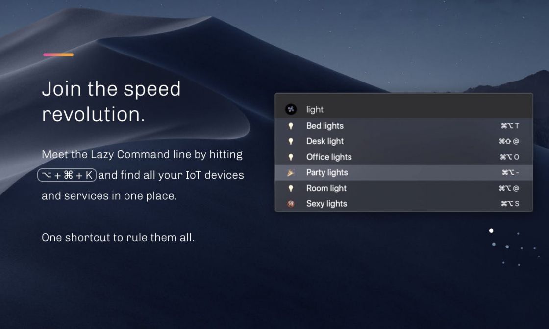 Keyboard-driven commands to manage your surroundings directly from your mac.Meet the Lazy Command line by hitting ⼠+ â + K and find all your IoT devices and services in one place.One shortcut to rule them all.