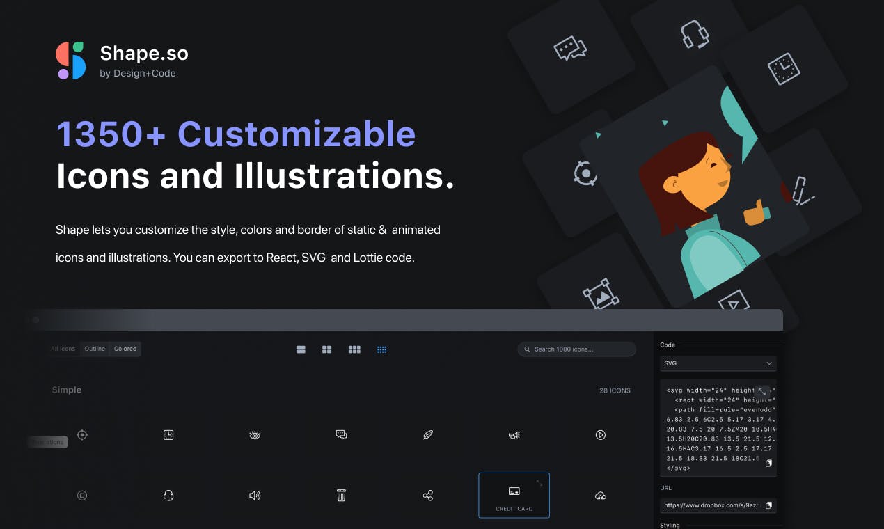 Shape lets you customize the style, colors and border of static & animated icons and illustrations. You can export to React, SVG and Lottie code. Browse and search through our large collection of icons with styles between Simple, Border, Color, Blend, Complex, Simple Solid, Border Solid, Blend Solid, Complex Solid.