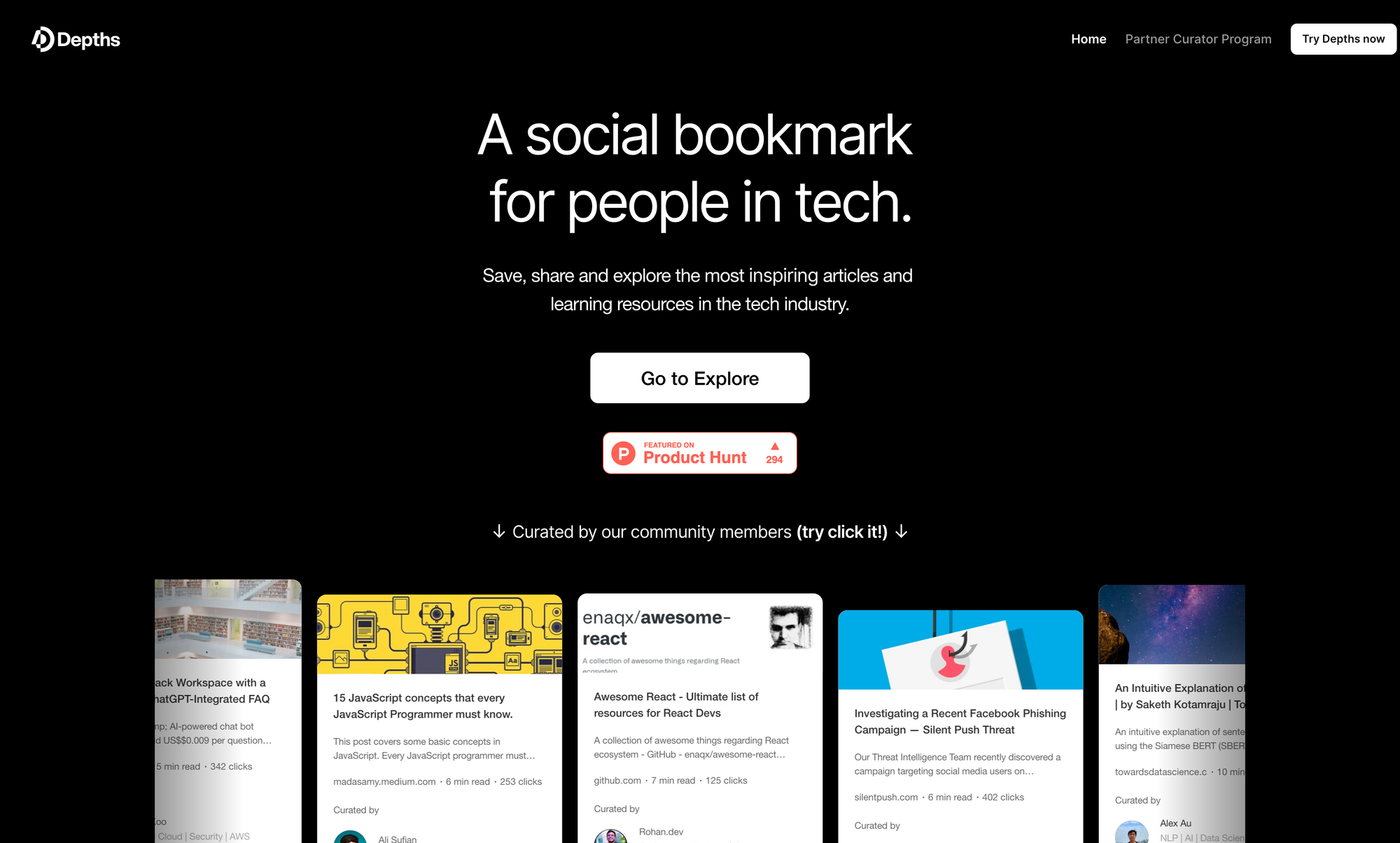 After revisiting Depths' website, I found out that it now entitles itself as "a social bookmark [app] for people in tech". The focus of Depths now is to create an app that gives people the possibility to save, share, and explore the most inspiring articles and learning resources in the tech industry. You can use Depths as your daily learning feed as it provides you with insights on what is inspiring the tech world, from domain experts's perspectives. Besides that, Depths can become your bookmark manager. Once you found an amazing article, simply save it to Depths with a single click by using its browser extension. But that is not it, since Depths can also be used as a way to connect with like-minded folks, as it introduces a social aspect to bookmarking and curation. Your Depths profile is your new social profile built based on your knowledge and knowings.