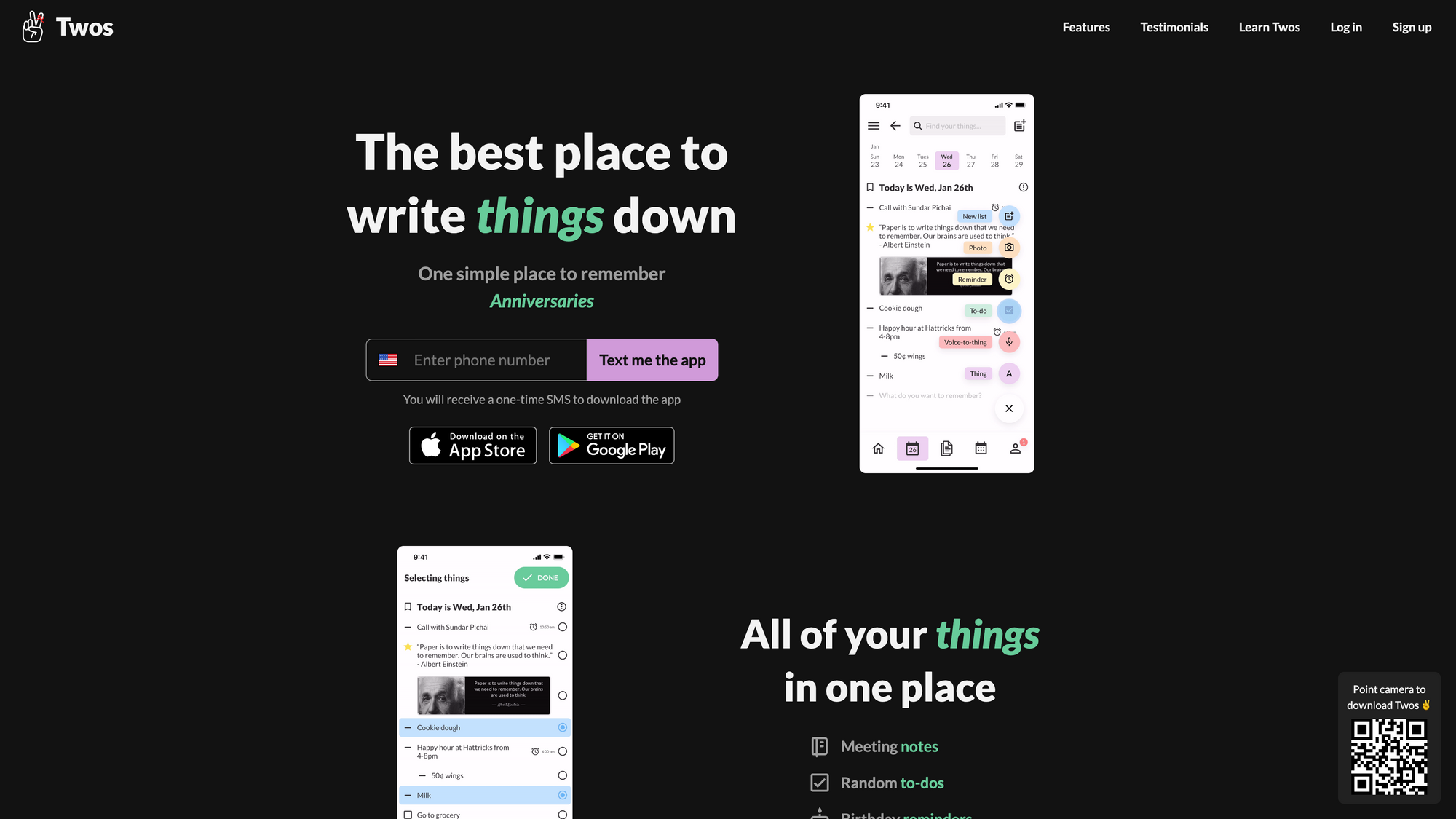 Twos aims to be your digital companion in todayâs digital age, in which our attention spans are shorter than ever. We expect digital tools to help us throughout our days to keep track, remember, and resurface names, tasks, ideas, notes, and other important things. But there are a lot of tools that add too much friction to a process that should be simple and fast, giving you the possibility to capture your thoughts with a few clicks or taps.