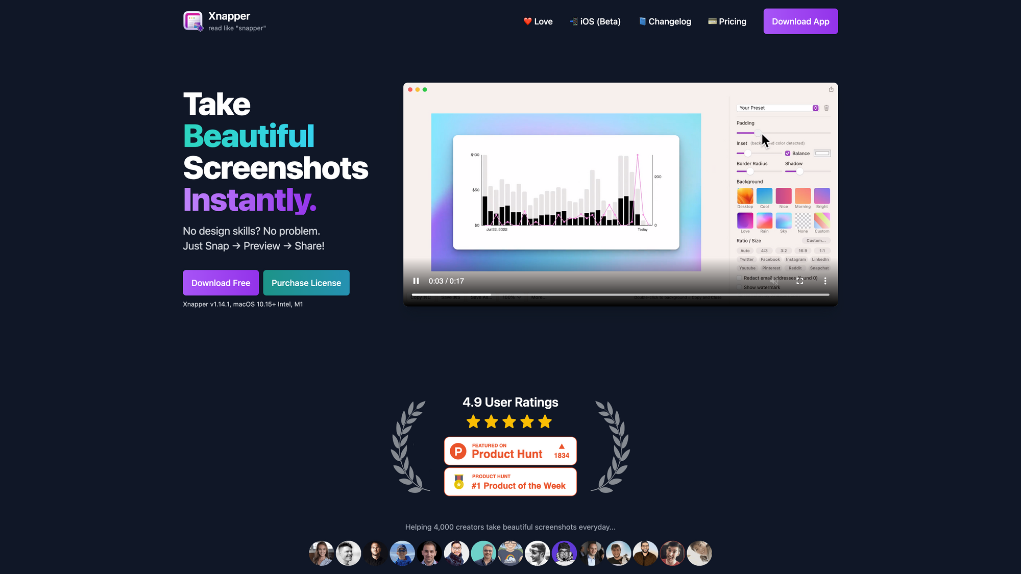 Creating beautiful screenshots can be time-consuming. First, you need to take the actual screenshot of a dedicated section of a website, a dashboard, a digital product, or anything else. Then, you probably move the screenshot to your preferred design tool, and add a background, some bounds or outlines, maybe a watermark, and some text. With Xnapper you combine this whole creative process into just a few seconds. After taking a screenshot with Xnapper, the area in which you have taken the screenshot will get placed in a card element on a coloured background, ready to share online. On top of that, Xnapper gives you powerful tools to customize and edit the screenshot to your needs. Add or remove padding, inset or balance your screenshot with a single click, increase or decrease the border radius of the card layout, add a shadow, customize the background or the ratio or size of the screenshot. It is a truly magical experience.