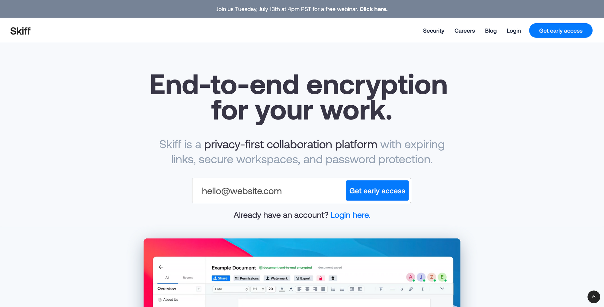 Skiff is a privacy-first collaboration platform with expiring links, secure workspaces, and password protection and end-to-end encryption as its core value. Skiff makes it possible to collaborate in real-time, with complete privacy. It allows you to send secure messages, documents, and links without leaving a single workspace. Stay within one tool with complete privacy in mind, no matter if you want to work on documents, chat with your colleagues, or take notes regarding a new project. If you want to share documents, links, notes or files with your colleagues, Skiff makes it possible to share these with end-to-end encrypted expiring links and password protection. If you want to learn more about how Skiff keeps your workspace secure make sure to check out their whitepaper.