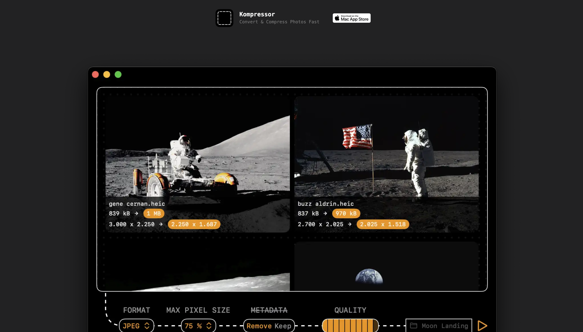 With Kompressor, you can drag and drop an image onto the content area, and then convert it to over 50 supported image formats like JPEG, HEIC, PNG, PDF, camera raw images, Photoshop files, Windows, and Mac icons. Once you dropped one image (or multiple ones), Kompressor's fun and lovely interface lets you choose the output format, the max pixel size, the option to remove or keep the EXIF data (like location or device model), the overall quality, and where to save it. Kompressor is optimized for performance and simplicity, which makes it delightful to use. No matter if you need to just quickly convert a single image, or a batch of multiple ones, Kompressor is fast and easy-to-use. Besides the most used image formats, Komrpessor lets you also convert images to more exotic formats like ASTC, EXR, HEICS, KTX, and more. I recently had to create App Icons for an app that is available for macOS and Windows. It was the first time I got confronted with converting an image to .ico and .icns. Luckily, Kompressor supports both and the task was done in seconds.