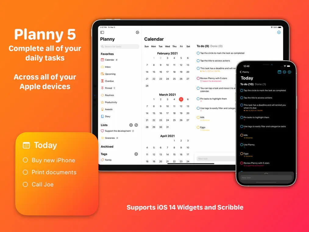 Planny is a beautifully designed task manager for iOS and iPadOS (and a native macOS experience coming soon). Planny is not your usual todo list. It combines all the important features you already know from other task managers with intelligence and gamification. So, what does that mean? In the morning and during your day, Planny recommends tasks, but also reminds you if you tend to forget them. If you add new tasks and complete them, Planny will reward you with productivity points. On the other hand, you will also lose them if you shift tasks or forget them. The gamification aspect continues as you can compare your productivity with friends throughout your week. With the most recent version of Planny, v5, the app got a whole new look. As I said earlier, Planny is beautifully designed, with human interface guidelines in mind, which gives the app a truly Apple native look. I am huge fan of Planny's approach of creating and completing daily tasks instead of jotting down countless tasks which gather in an ever-growing backlog, where you probably will miss and forget about most of them. Planny makes it super easy to keep track of all your open tasks.