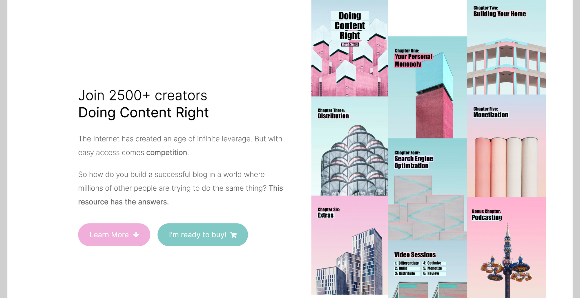 Steph wrote the book Doing Content Right back in 2020. It contains 270 pages full of pure value. You will learn how to identify a niche and stand out in a sea of competition, how to distribute your content seamlessly across dozens of channels, how to do SEO right, and a lot more. Besides the book, Doing Content Right gives you also access to 22 exercises that challenge you to turn the theory into action, 12 recorded video sessions, a creator community with 500+ members, and a bonus chapter on the topic of Podcasting.