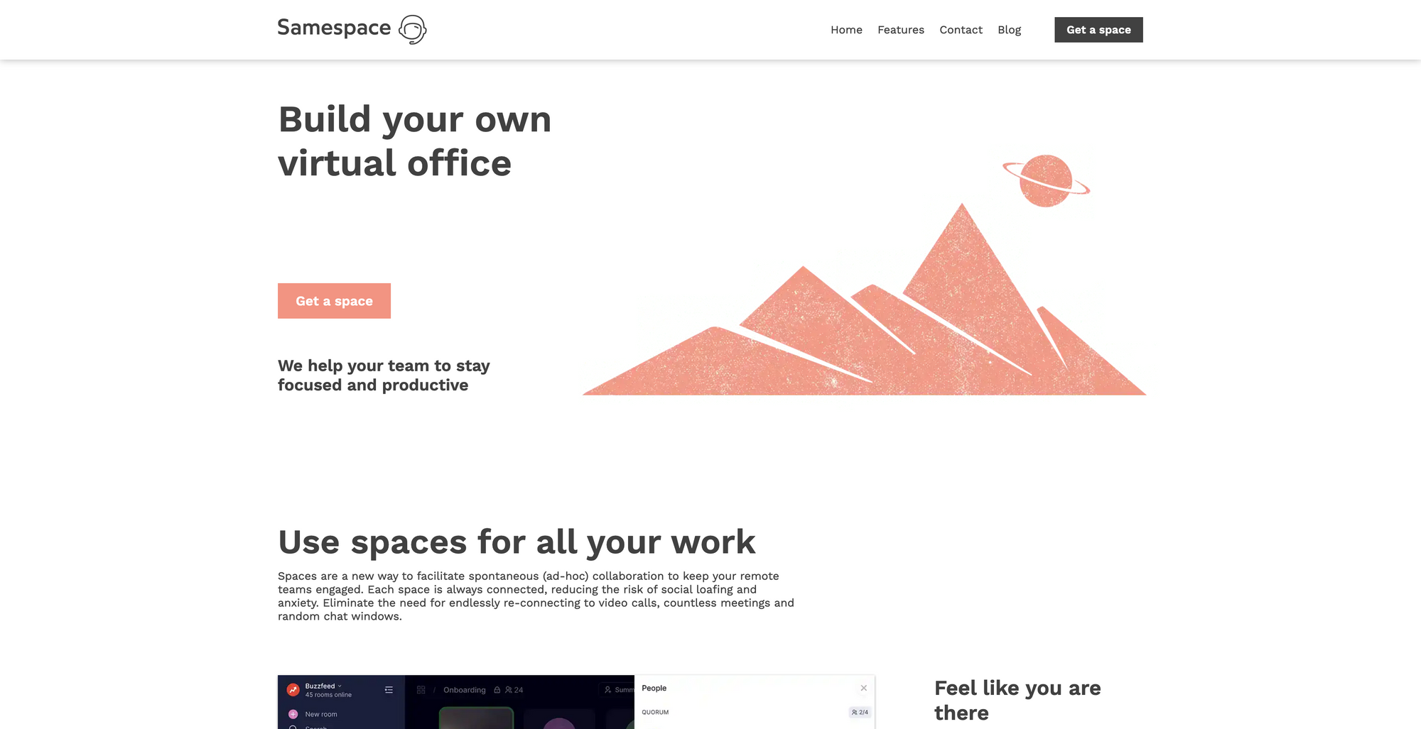 Samespace is a tool that lets you build your own virtual office, so you can stay productive while working on collaboration tasks together with your team. Within Samespace you can create spaces which are audio rooms to facilitate spontaneous (ad-hoc) collaboration to keep your remote teams engaged. Step into a room together with your team members to discuss, collaborate or just hang out. Within a space, you have the possibility to share your screen, use flip charts and whiteboards. Within your company's Samespace, every employee can join any space know who is working on what.