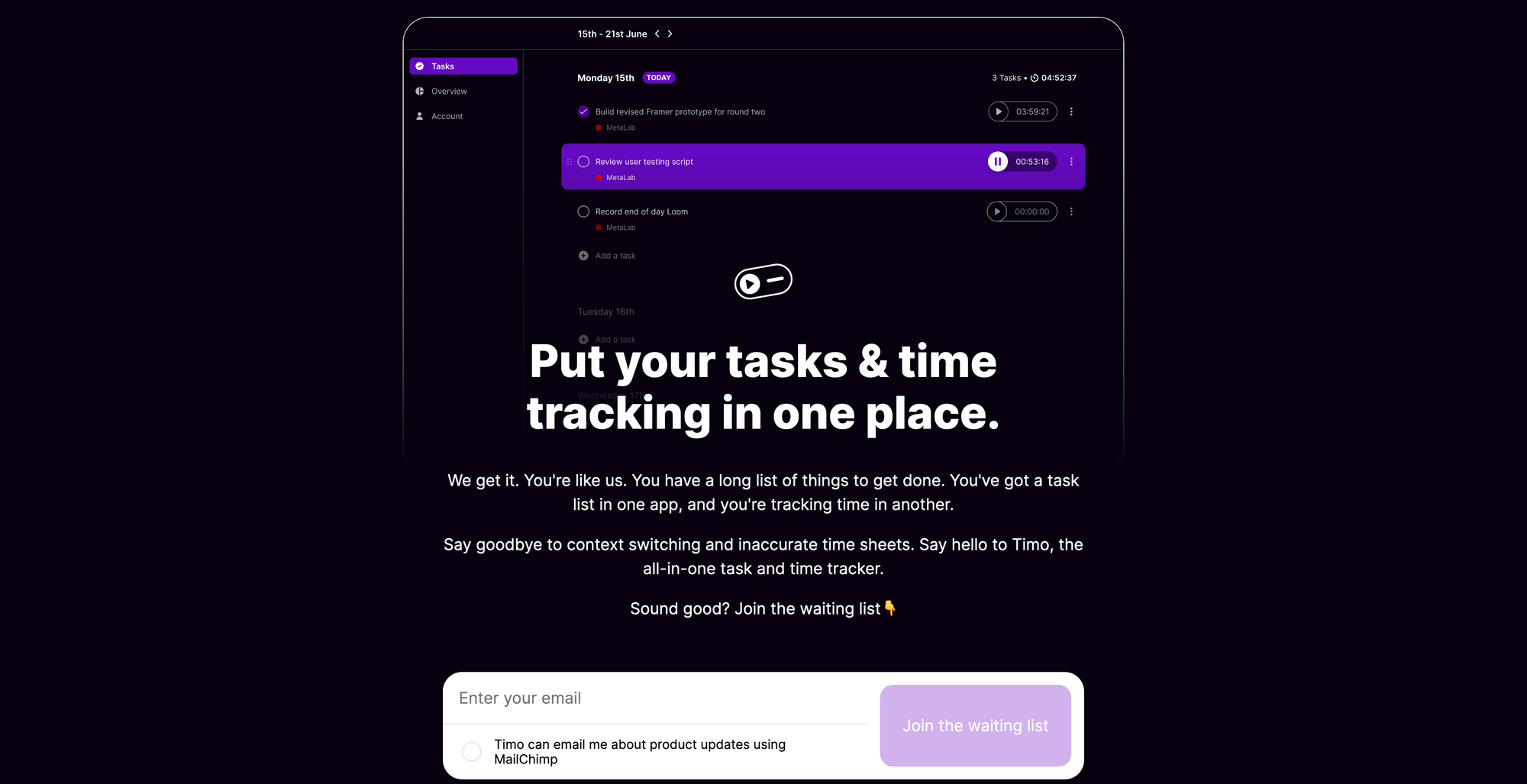 Timo is a really interesting productivity tool as it combines your tasks and time-tracking within one single place. When I worked as a freelancer couple years back, time-tracking was an essential part of my work. I used different tool to jot down and structure my todo's, and do the time-tracking when working on those todo's. Therefore, I can totally see the advantage of having those two products within one single tool. Switching between tools back and forth can sometimes be time-consuming, although we all have a different kind of workflow. With Timo you can easily keep track of all your open task, and you can add another layer for organisational purpose by further structuring your tasks by clients or projects. Timo is currently in beta, and you can join their waiting list right now. They state on their website, that they do plan to work on native apps for all kind of platforms, but for now Time is a progressive web app, which means that you can install it on your phone or even your Mac and use it just like a native app.