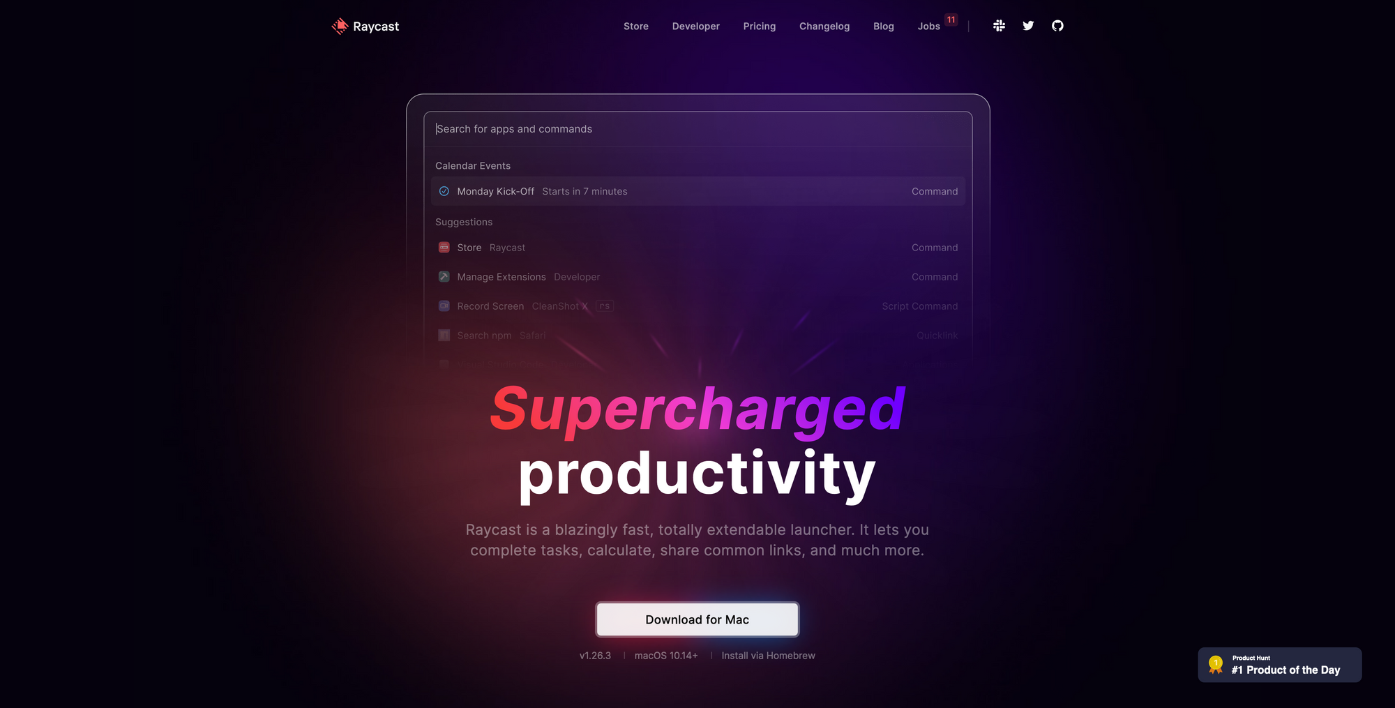 Raycast is a blazingly fast, totally extendable launcher. It lets you complete tasks, calculate, share common links, and much more.