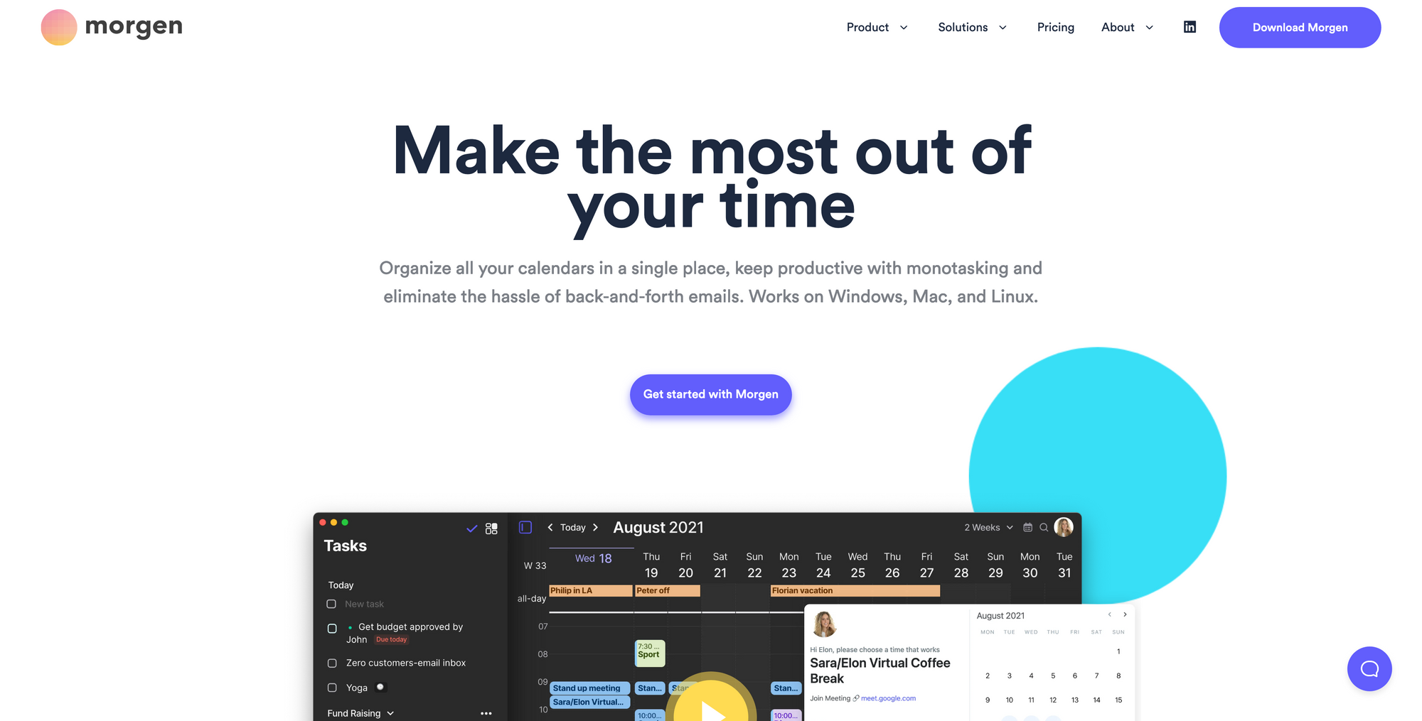 What immediately caught my intention when I first took a look at Morgen, was the fact that they focused on a cross-platform experience (desktop only for now) straightaway. Nowadays, it becomes incredible rare within the area of productivity tools, that the makers and teams behind those tools aiming to support multiple platforms. But that is not the only thing that caught my interest regarding Morgen. Although Morgen is still in an early stage, the team behind the tool managed to craft a beautiful experience, packed with exciting features like share availability, powerful shortcuts like Option + C which gives you a quick peek at your calendar, offline mode, and todo lists including the possibility to schedule your tasks with a simple drag and drop and therefore perform time blocking.