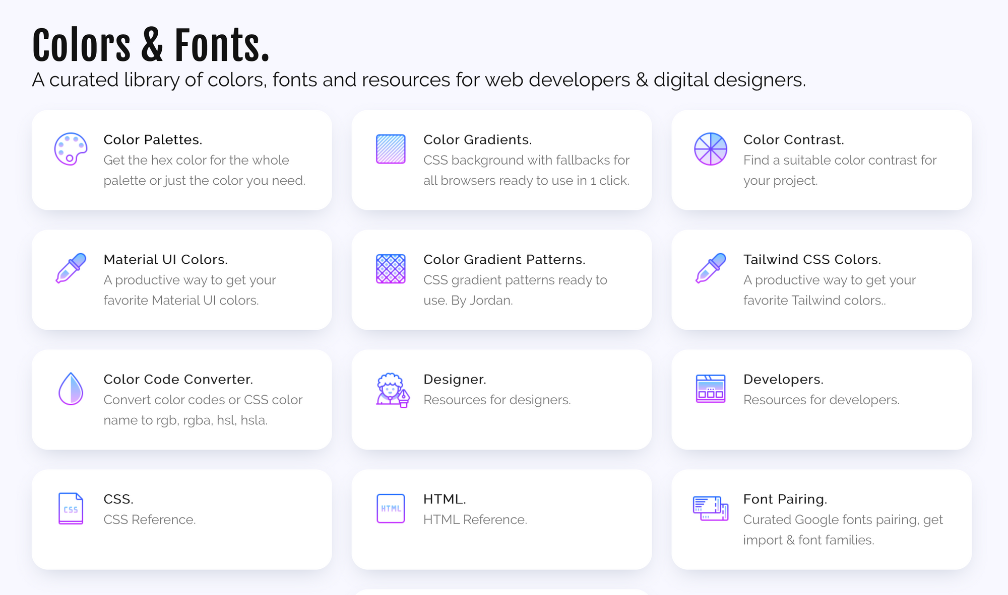 A curated library of colors, fonts and resources for web developers & digital designers. All the great resources in one dedicated place.