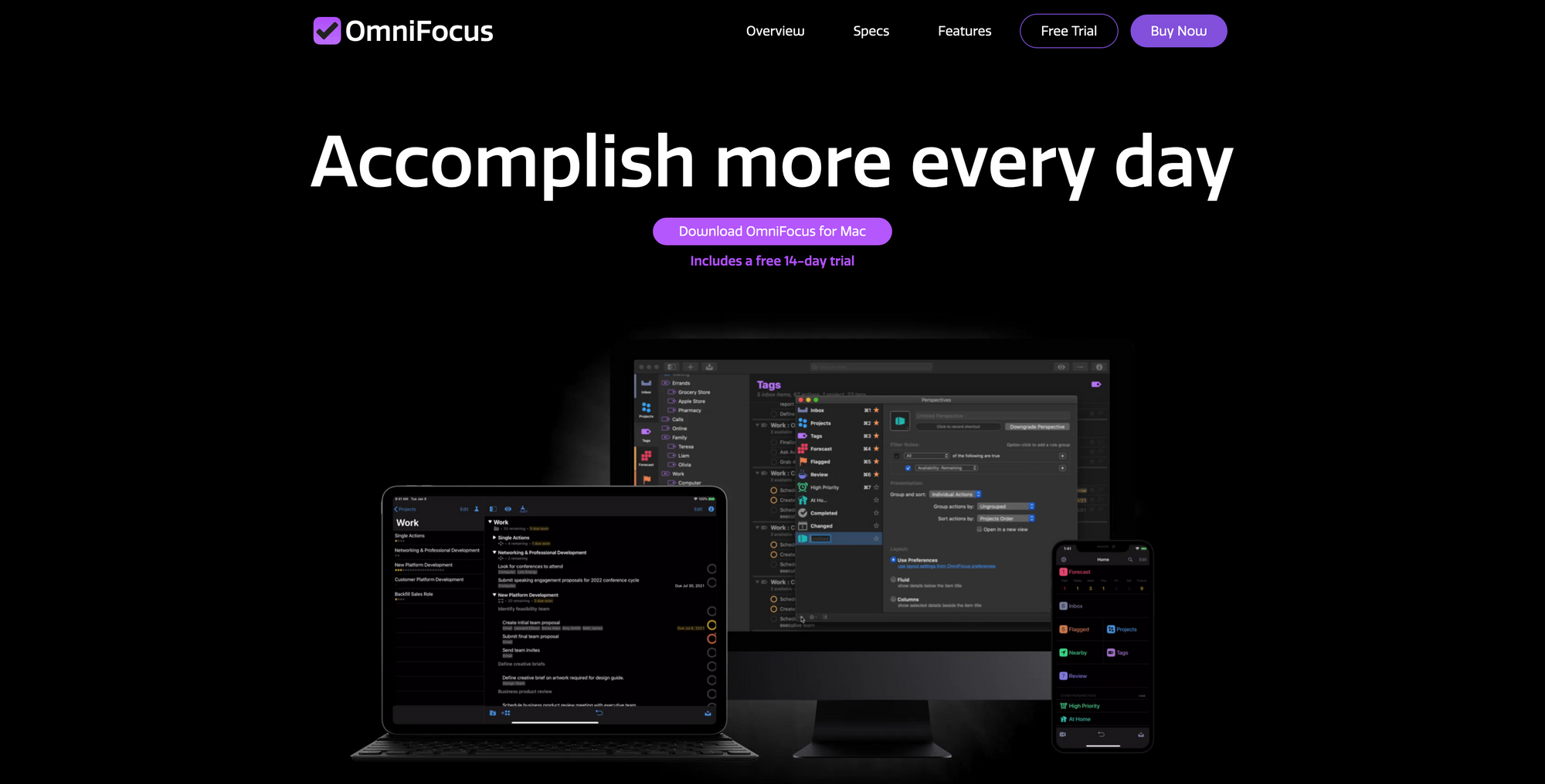 OmniFocus acts as a second brain, making it super easy to capture all your tasks and allowing you to organize them in a powerful system. Add all the tasks that come to your mind straight to your inbox, you can always manage, structure, and organize them at a later point. With OmniFocus you always see the big picture. OmniFocus offers different ways of structuring and organizing all your tasks, you can use projects, tagging, and due dates to quickly layout your week. There is also the so-called "Forecast" view which gives you a great overview of what is coming up next.