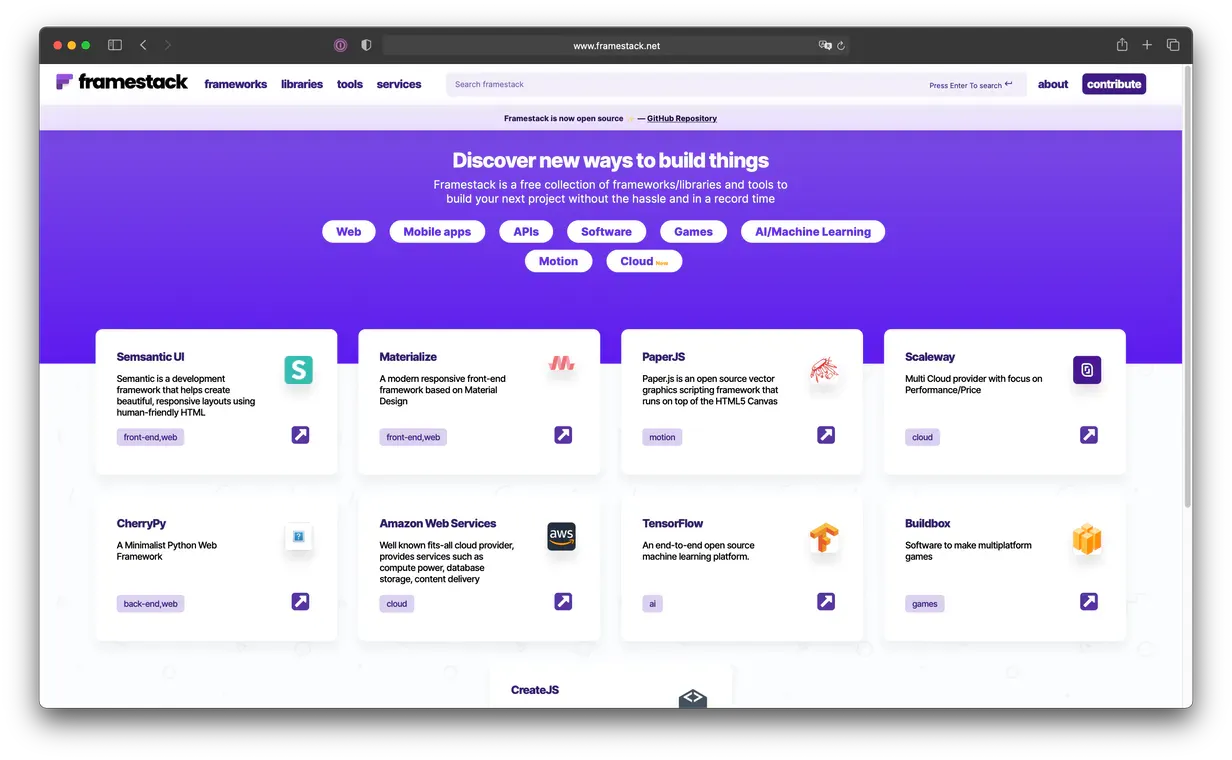 Framestack is a lovely open-source resource and collection of frameworks, libraries, and tools to kickstart your next project. Within Framestack you will find different categories to filter down your search. No matter if you are looking for resources or tools for web, mobile, APIs, Motion, Machine Learning, or Games, Framestack got you covered showcasing amazing frameworks and tools which will surely help you get started with your next project. Since Framestack is open source you can also contribute to the project by adding more frameworks, libraries, or tools.