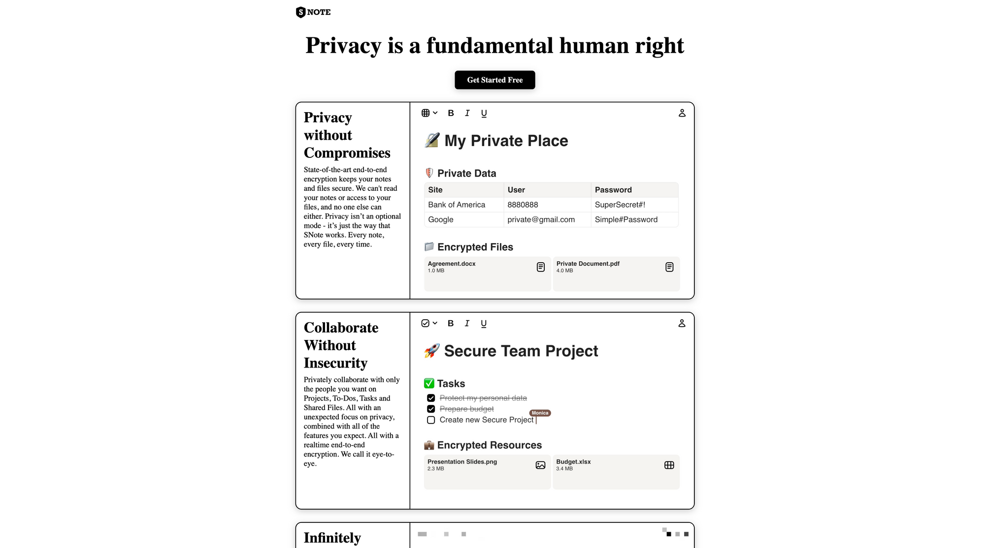 What is even more powerful, is the fact that SNote offers this privacy-focused experience not only for individuals, but also for folks who want to collaborate without insecurity. SNote gives you the possibility to collaborate with only the people you want to work on projects, todos, and shared files. All with an unexpected focus on privacy. Even while collaborating, SNote is offering a real-time end-to-end encryption.