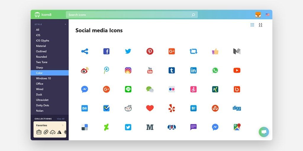 Get free icons designed to combine perfectly and fit into the style of your design. Icons8 is a massive selection of free icons. Their web app has a simple UI layout, so you can quickly find what you are looking for!