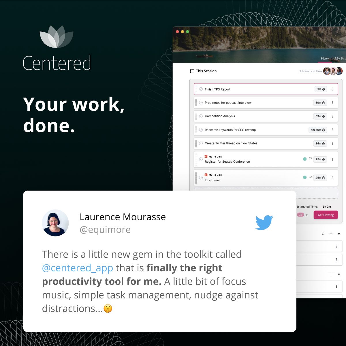 Centered, the fastest way to work. Centered offers scientifically-designed Flow Music, an AI Productivity Coach, a Distraction Blocker and so much more!