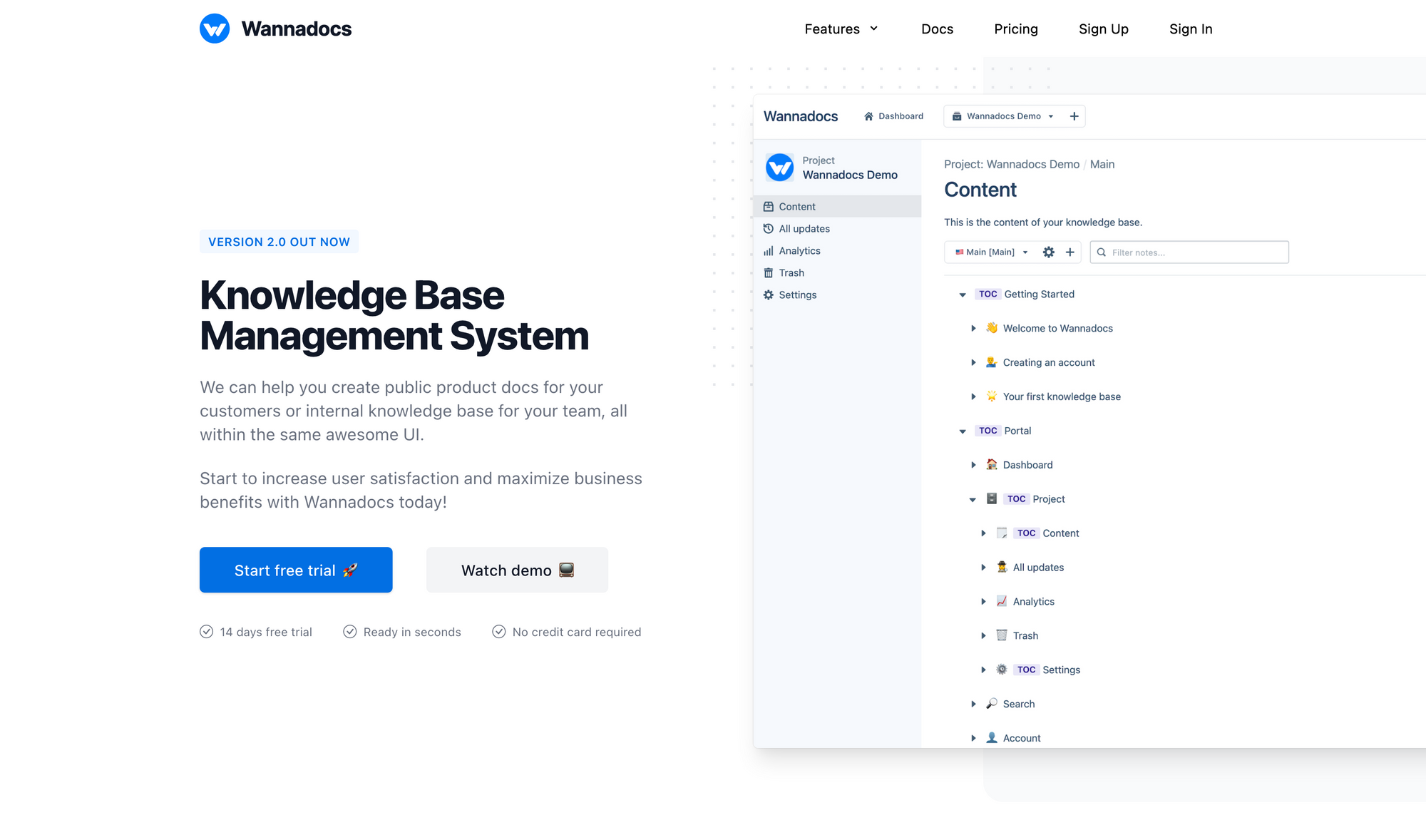 Wannadocs is a knowledge base management tool that lets you create public product docs for your customers or your internal knowledge base for your team. It is exciting to see that more and more people realise how powerful knowledge base management systems can be and that they also see the value such a system could bring to your team and your customers. Wannadocs is here to help you increase user satisfaction and maximize business benefits.