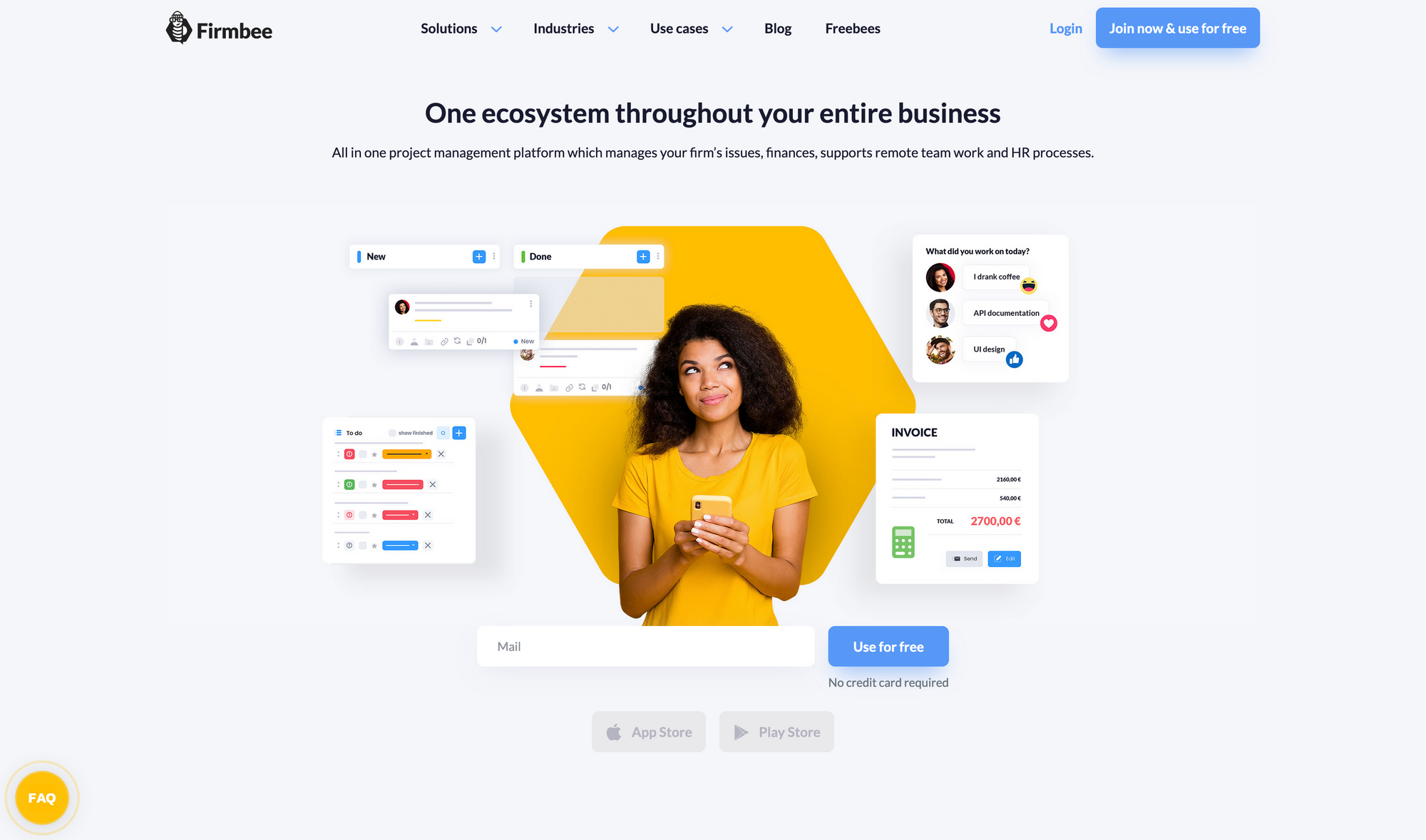 Beyond that, Firmbee is capable of managing your contacts, recruitments, revenues, expenses, invoices, leads, deadlines, products, and offers, all within one centralized tool and workspace. That is exactly what you would expect from a tool entitling itself as âall-in-one workspace and project management platformâ. With the board feature-set of Firmbee, it is attractive for several industries. Firmbeeâs endless possibilities and customization options it is a great fit for Sales, Design Teams, Marketing Agencies, Event Planning, IT Teams, and more. After exploring Firmbee and its broad feature-set it is beyond exciting that, it is offering a limited free version of the tool. The free plan of Firmbee is perfect for Freelancers, giving you the possibility to manage up to 3 projects, up to 10 invoices, up to 5 coworkers, and for 2 users.