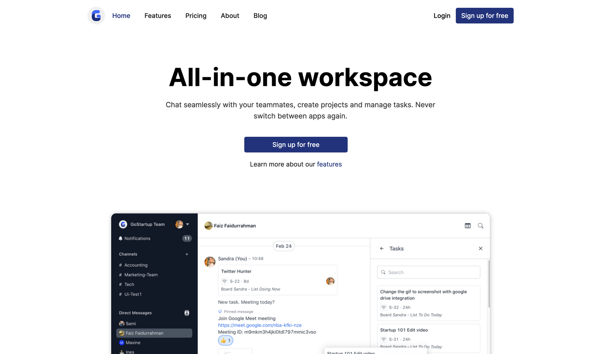 While Firmbee (mentioned earlier) provides an all-in-one workspace by offering a broad feature-set that ranges from project, task, finance, recruiting, and other management areas, it seems to me that GoStartup built a Slack-Alternative with built-in task management capabilities. When all your teamsâ communication happens within your messaging app, it makes sense to have built-in task management functionality since you can quickly turn any kind of message into an actionable task. You can use GoStartup for free with limited features. The Premium Plan will cost you âŹ38.30 per year or âŹ3.99 per month.