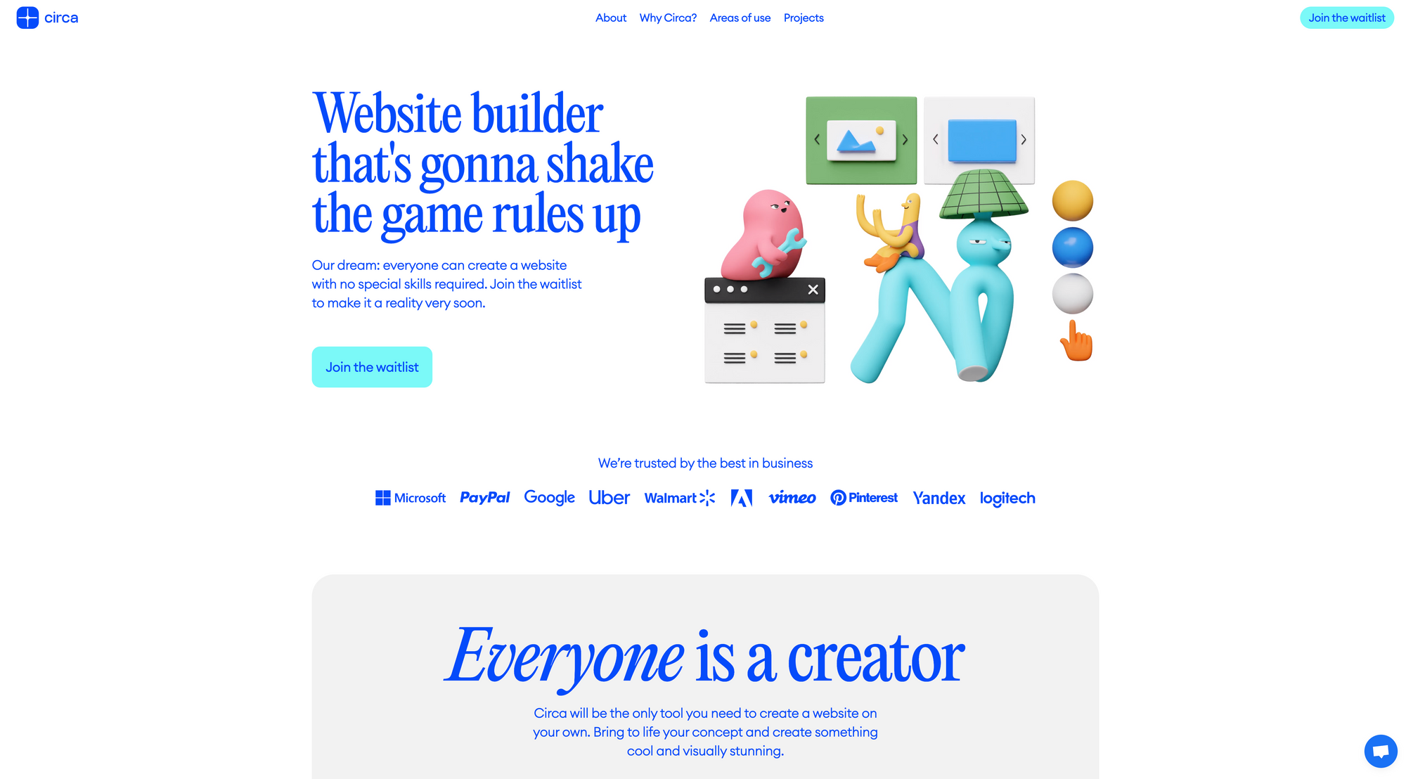 I am not a huge fan of making statements on a website of a tool that is still locked besides a waitlist, which are as bold as Circa's. The hero section on their landing page says "Website builder that's gonna shake the game rules up". This leads to high expectations. When it manages to answer them, lovely and great work, but if not it is yet another example why you should not aim to high. Webflow shook up the rules, Framer did too, so how is Circa going to achieve that? We will see. The goal of Circa is to give everyone the possibility to create a website with no special skills required. It wants to become the only tool you need to create a website on your own. No matter if you are content creator, freelance designer, artist, photographer, whatsoever, Circa aims to become the simplest solution to build a website by offering an easy-to-use tool structure for any level of design skills, 100% proper results, and the possibility to export in one click, so you can move it to your server whenever you want.