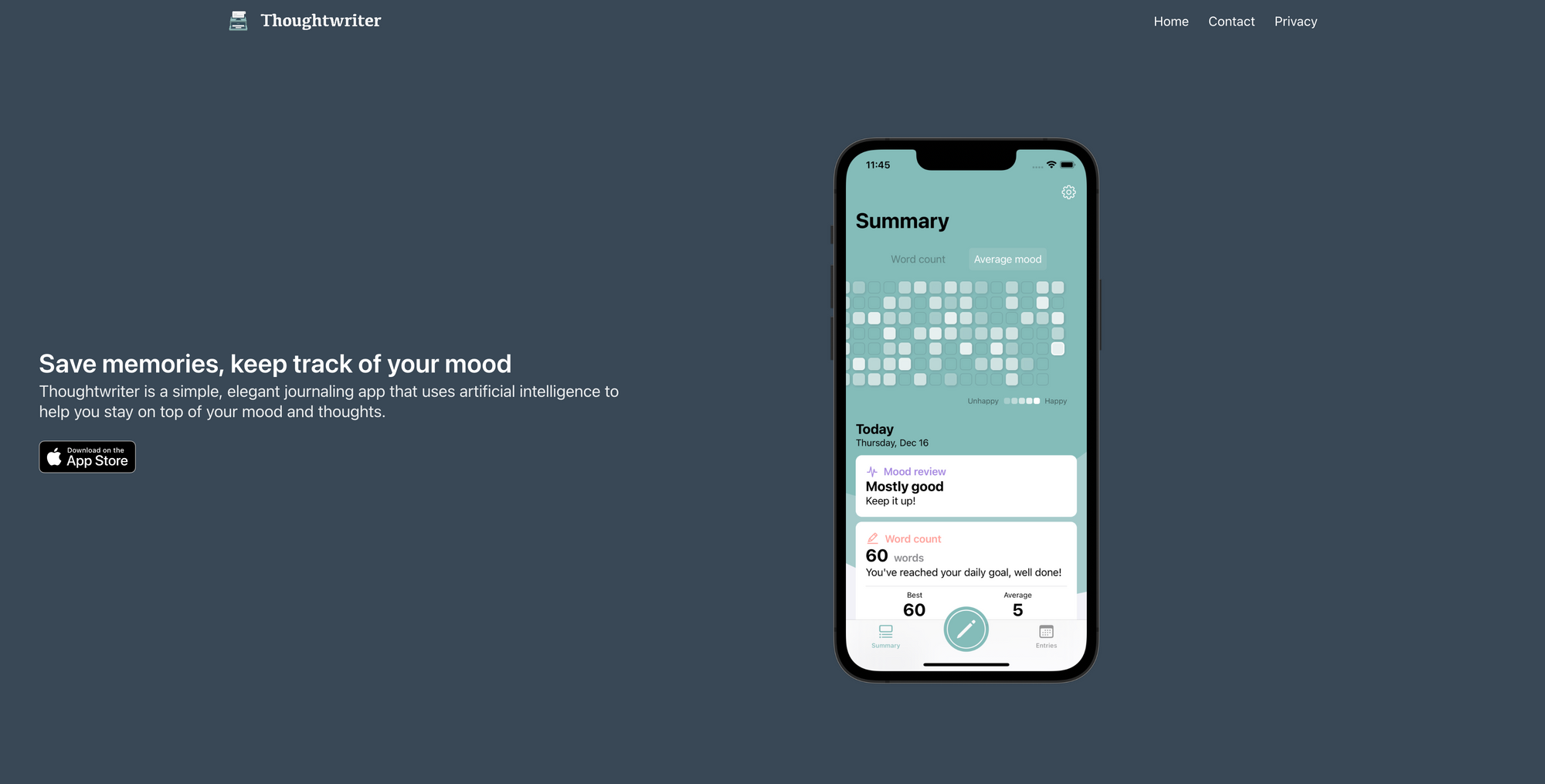 Thoughtwriter is a beautiful, elegant, and super simple app to journal, save memories and keep track of your mood, available for iOS. Thoughtwriter uses artificial intelligence to help you stay on top of your mood and thoughts. This built-in AI understands your mood while you write and journal within Thoughtwriter. As you are writing and journaling more and more over time, Thoughtwriter will learn from you and becomes more accurate regarding your mood. While journaling with Thoughtwriter, you do not have to worry about data privacy, as everything happens and stays on your device and not in the cloud. All your precious thoughts and notes will stay yours and never ever leave your device.