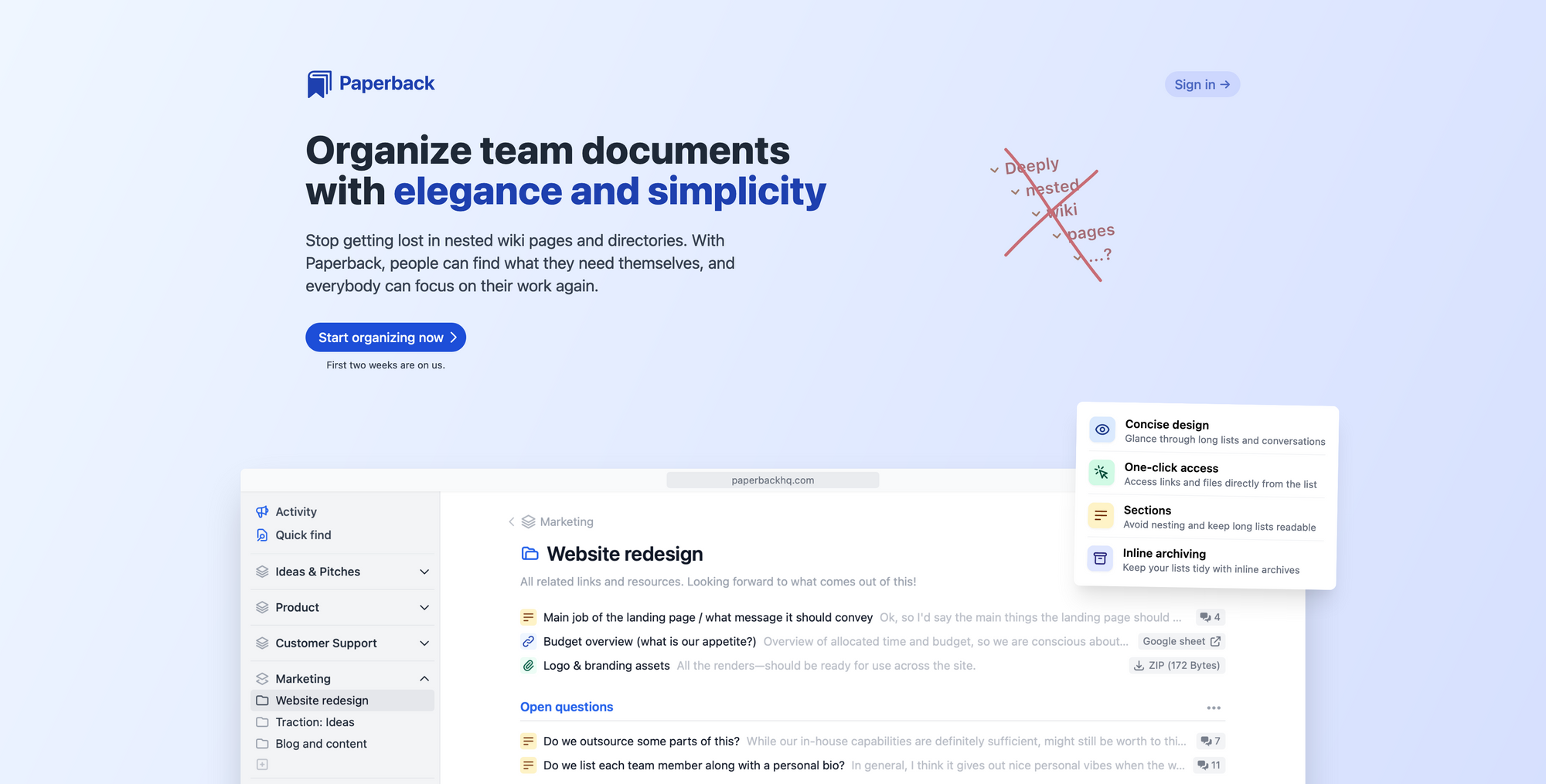 As your team at work is growing, you might want to look into ways of documenting and creating wiki pages and directories for onboarding, tutorials, guides, and things you want to keep track of in general. Quite a lot of tools for those use-cases use nested wiki pages. The problem with nested wiki pages, as your directories grow, you could get lost within those nested wiki pages quite easily, and it will become hard to actually find the dedicated pages you are looking for. Paperback is a great tool to organize your team documents with elegance and simplicity. Paperback helps you structure all your important documents so you and your team can find what they are looking for.