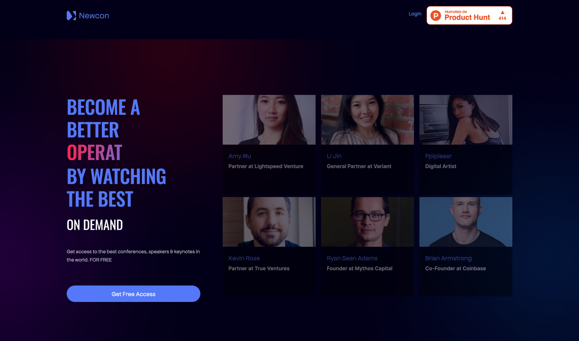 With Newcon, you get on-demand access to over 100 of the worldâs best thought leaders and conferences in the areas of entrepreneurship, VC, growth, Web3, Climate, Diversity, Community, Creator Ecomony, and more. With Newcon everyone gets access to insightful keynote presentations, fireside chats, and interviews by thought leaders just like Li Jin, Kevin Rose, or Brian Armstrong.