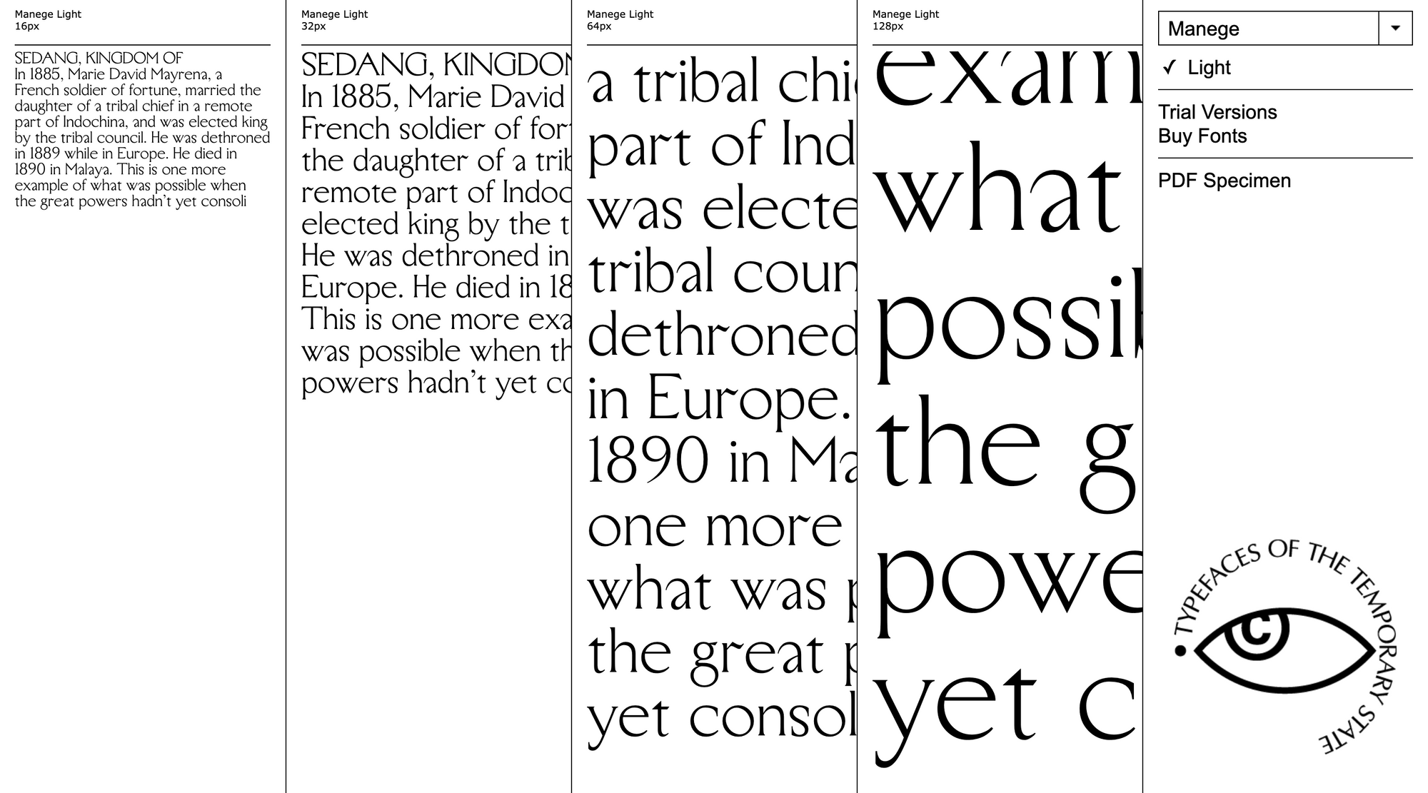 Manege is a serif typeface designed by Roman Gornitsky and published through Russian foundry The Temporary State in 2017. It was created for the 200-year celebration of the Manege Central Exhibition Hall in Moscow. The design attempts to combine âmonumentality with clumsiness.â The family is available in a single light weight without italics.