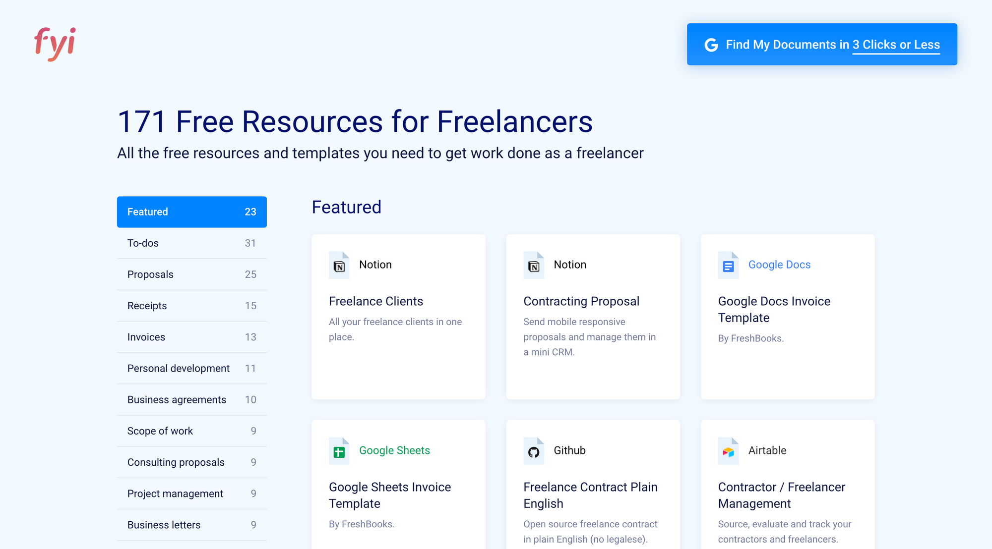 An up-to-date list of 171+ free freelancer templates and resources covering 24 categories including proposals, contracts, invoices, to-do lists, & personal development. Youâll find resources from your favorite tools including G Suite, Notion, Trello, & more.