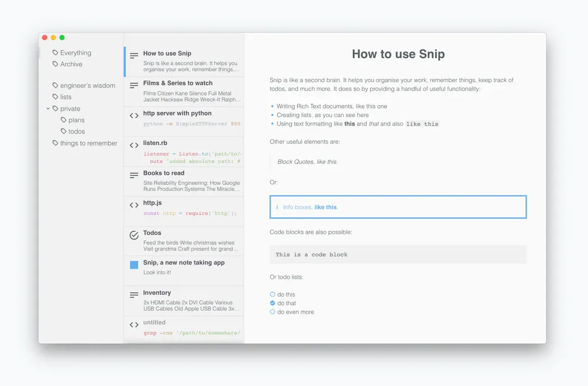 To structure all your notes, Snip is offering tags and folders, but in a slightly different way. Tags are folders, and folders are tags. That means you can use in the classic sense, e.g. lists, if you use a slash, like private / plans, you can organize your content in a folder-like structure. Snip even features the powerful shortcut CMD + K which will give you quick access to links and code snippets. Currently, Snip is available for macOS, Windows, and Linux. It is still early days for Snip, so you can be prepared for more features to come in the near future.
