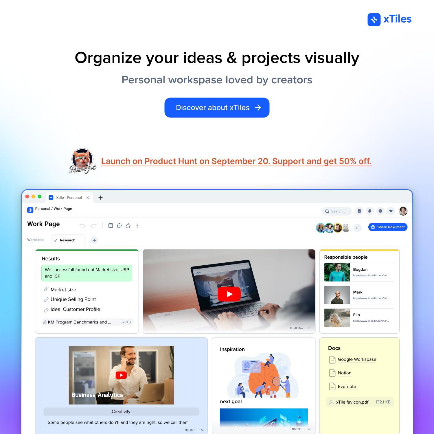 xTiles is a cross-platform note-taking app helping creators structure, enhance and present projects in one place.Our mission is to create the best tool for thoughts for creative persons such as marketers, researchers, writers, students, and chiefs. Feel free to try it out, and don't miss our big PH launch!