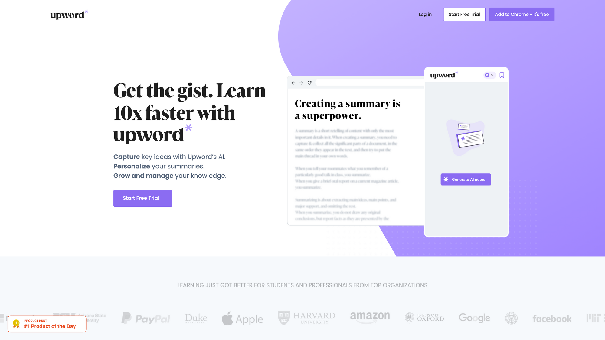 No matter if you are a college student, a young professional, or simply a curious individual, Upword was built for learners at heart and in mind. Upword aims to help you take your learning experience to the next level, powered by AI. Upword features powerful AI tools that give you the power to create efficient summaries of the content you consume to learn. With Upword's AI you are able to cut your reading time by up to 85% while still getting the insights you are looking for. Upword scans the text you want to read or study for you and captures only what is actually important. Once Upword finished creating your efficient summary, you can add your own notes to fit your style. Advanced editing methods in Upword give you the possibility to highlight and capture info, comment and add your own thoughts, or attach files and URLs. Personalising your learning experience never has been that easy.