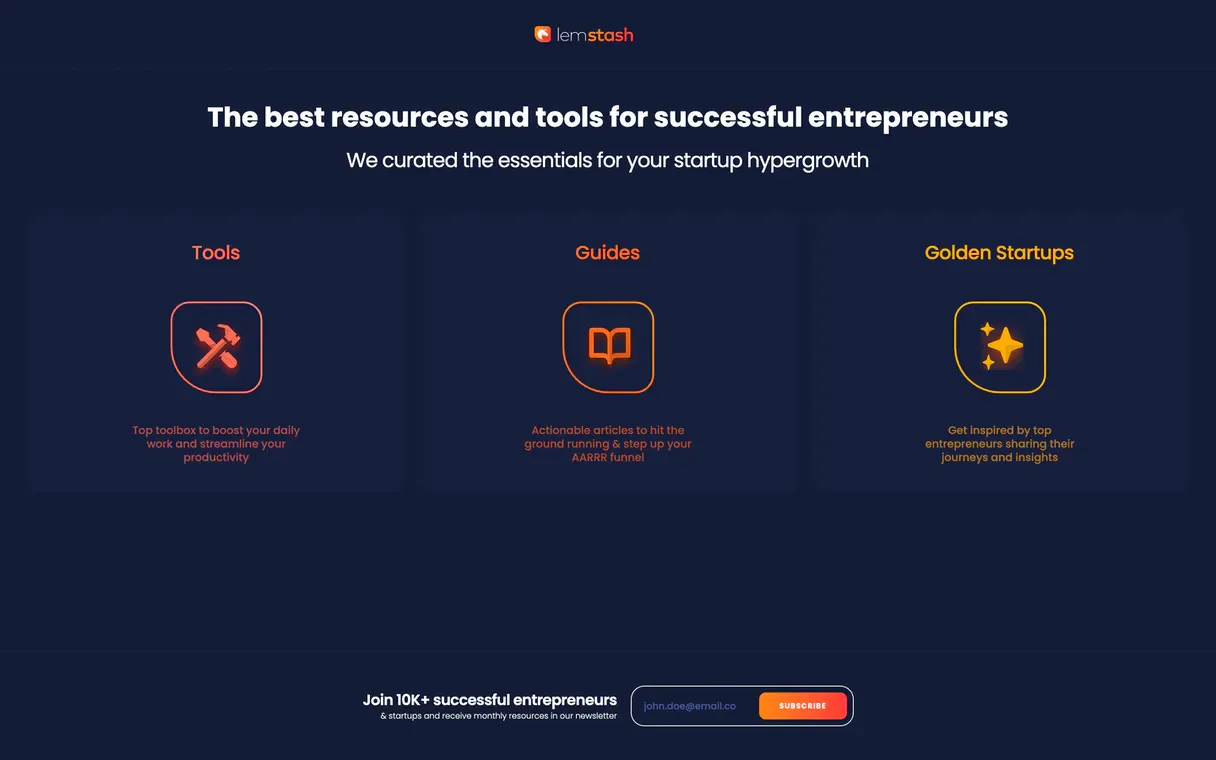 lemstash also features super-useful guides about topics like onboarding, copywriting, growth, or revenue. The "Golden Startups" category gives you real-world examples of people who successfully built, launched, and grew their products and startups. Definitely worth checking out!