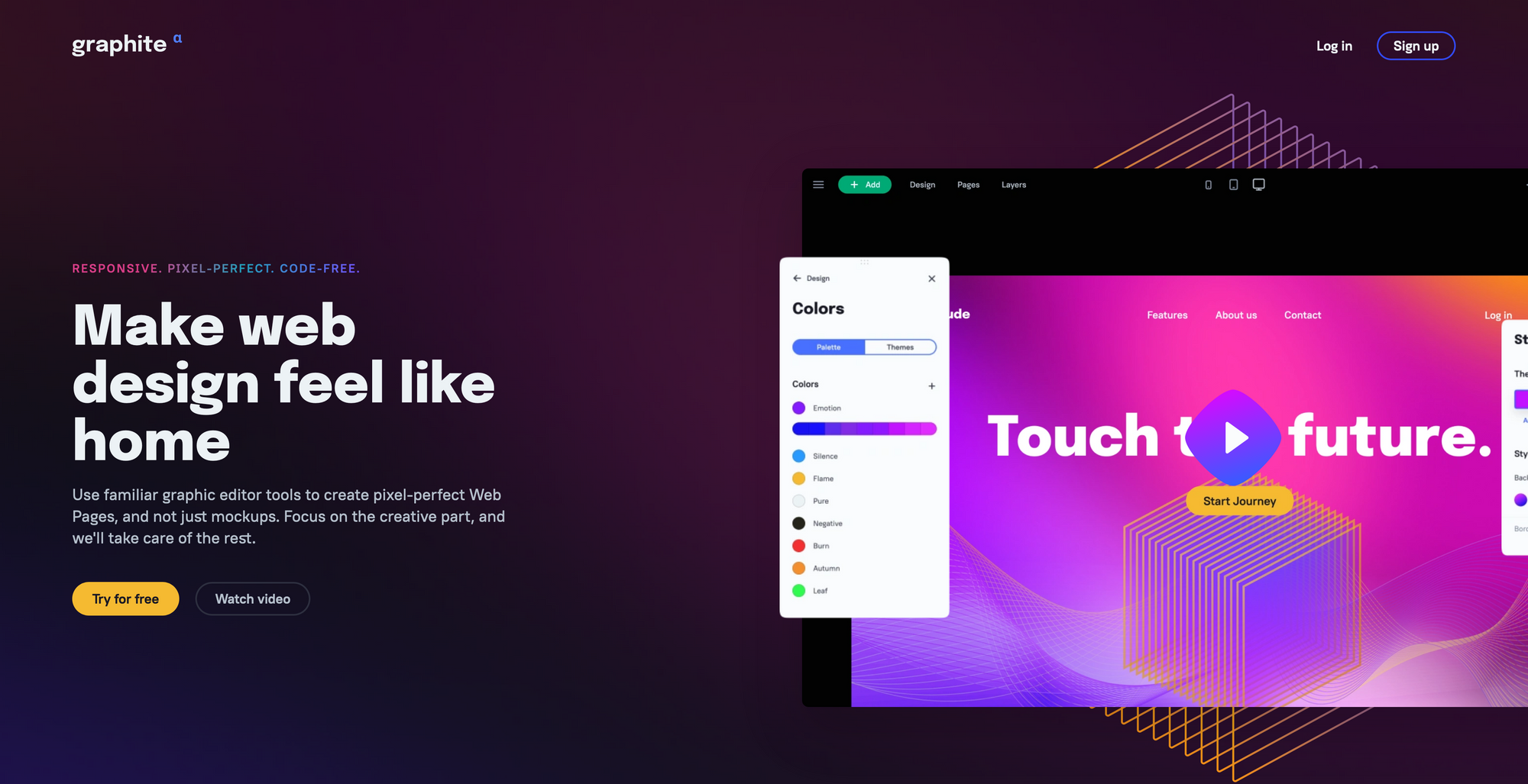 Graphite is a beautifully, free online website builder. It got built with web designersâ best interests in mind. Graphite features familiar graphic editor tools to create professional-grade web pages and publish them online without working with HTML, CSS, or JavaScript code. Graphite gives you all the design freedom you need. Start with a template or completely from scratch, customize the responsive grid, and switch between absolute and auto-layout positioning on the fly, if you are done one click is all it needs to publish your website and see it live. Graphite has a superior suite of features, which give you full control over the design of your website.